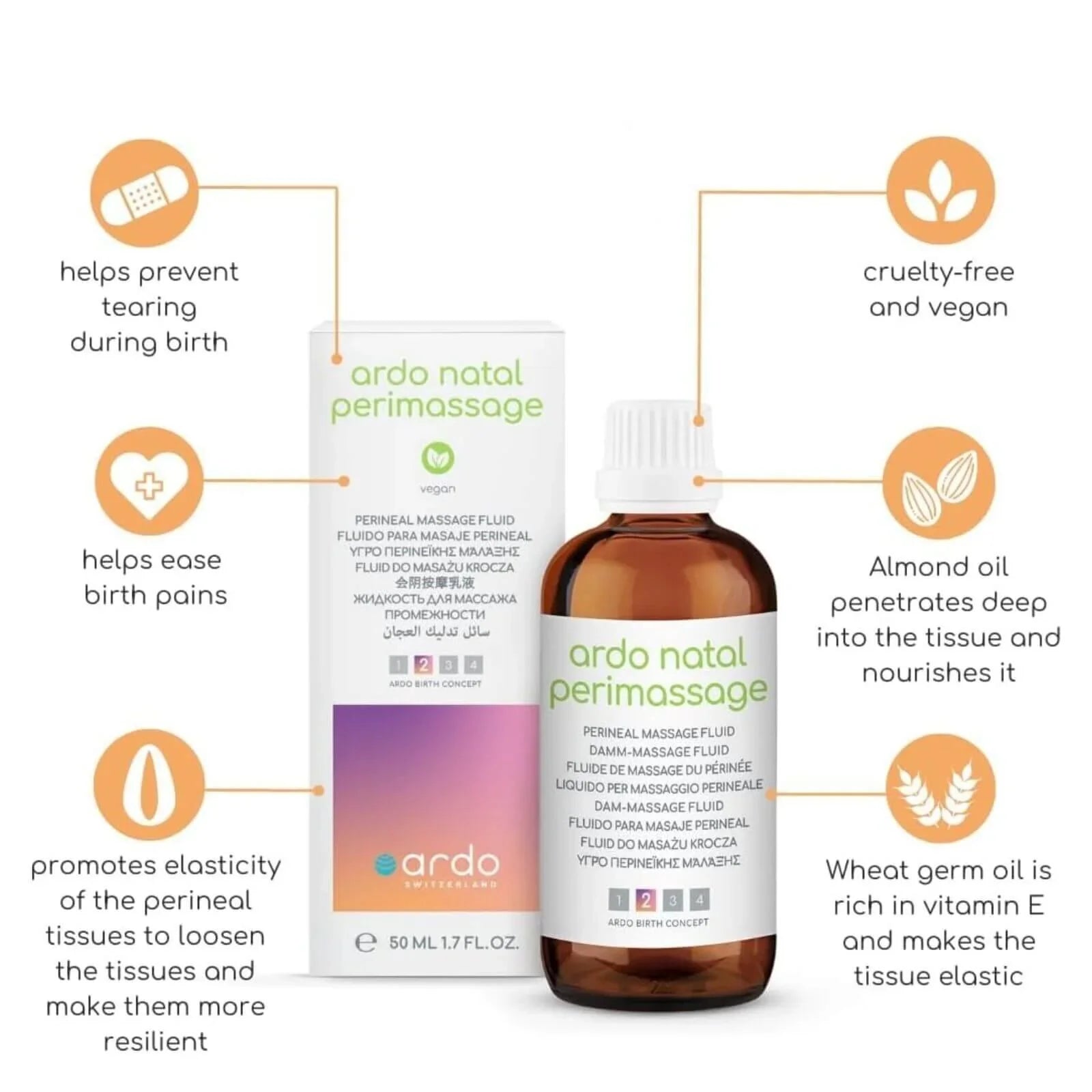 Perineal massage should be started in the 34th week of pregnancy. Carry out the perineal massage at least three to four times a week for 10 to 15 minutes each time. Wash your hands thoroughly before applying the fluid, then place enough of the fluid on your fingers and start massaging the perineal area. Start with circular and stretching movements. If you have any questions, please do not hesitate to contact your doctor or midwife.