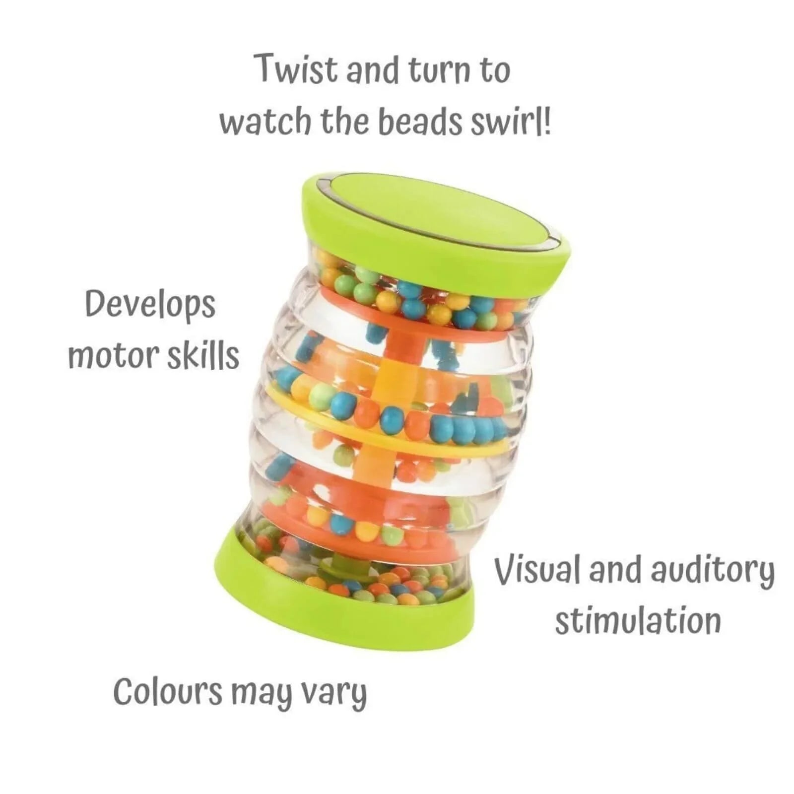 Little ones will be mesmerized by the brightly coloured bead cascading through the tube - the perfect visual stimulation. Textured casing allows for an easy grip.