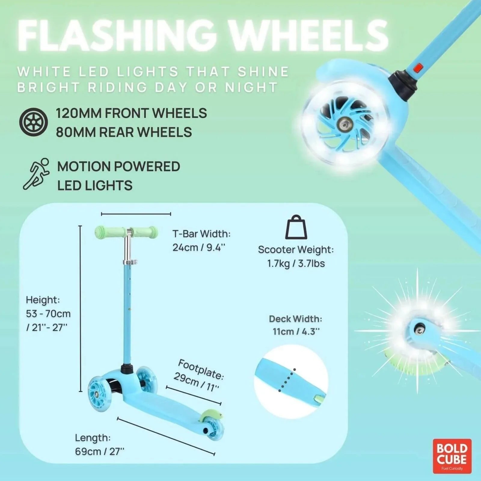 - Bright white glowing flashing wheels, on both front and back wheels that are powered by motion. Who needs batteries!