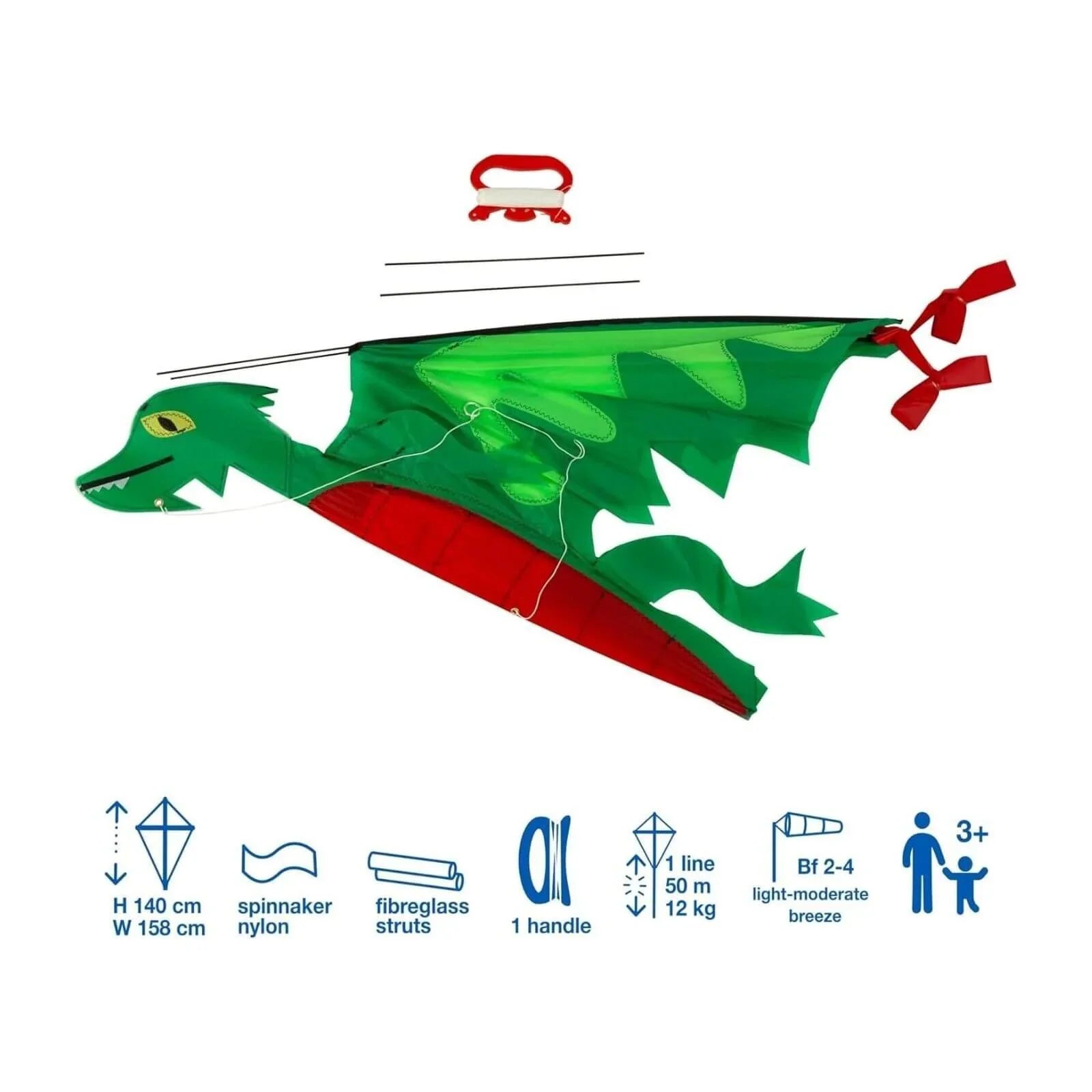 Brookite 3D Chinese Dragon Kite made from spinaker nylon with fibreglass struts. Single line with 1 handle. For use in a light-moderate breeze (Bf 2-4). Dimensions (H) 140cm x (W) 158cm. (55.12"H x 62.20"W) Recommended Age 3+