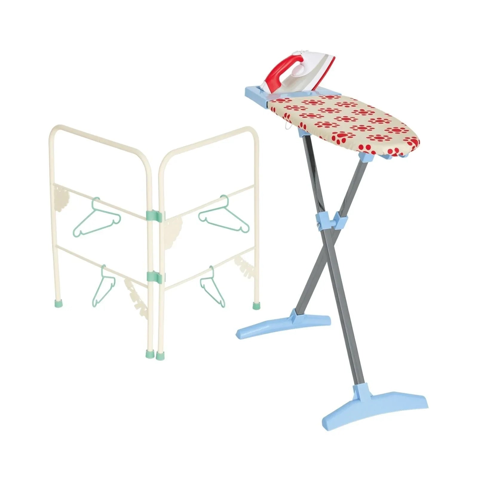 Includes: Adjustable ironing board with storage tray, replica toy iron, folding clothes airer and four hangers.