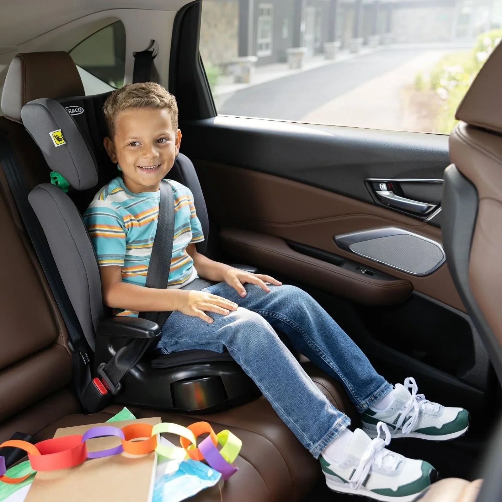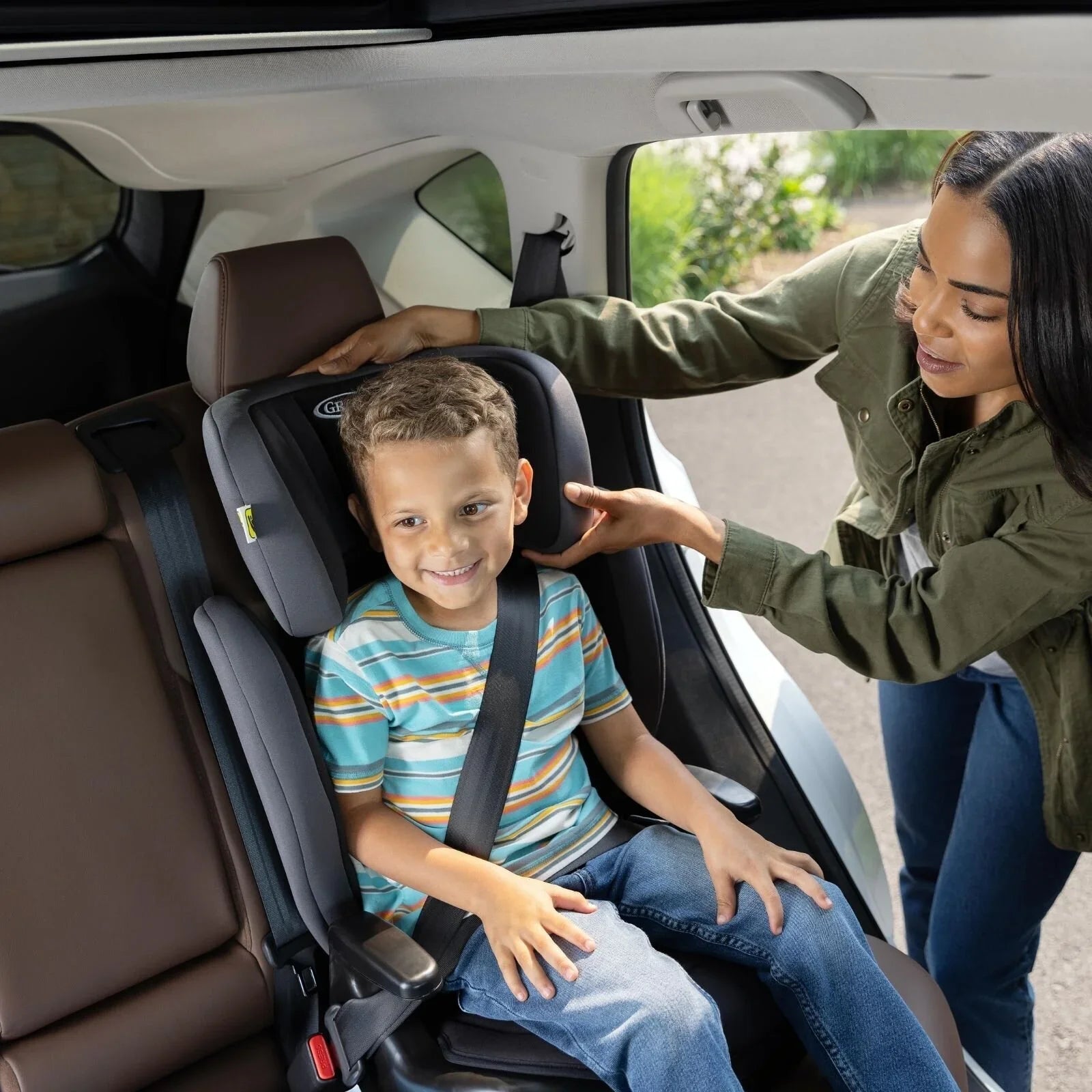 Details: 10-position height- adjustable headrest, soft cushioned seat pad, retractable cupholders, open-loop belt guides to help ensure proper seat belt positioning and machine-washable covers.