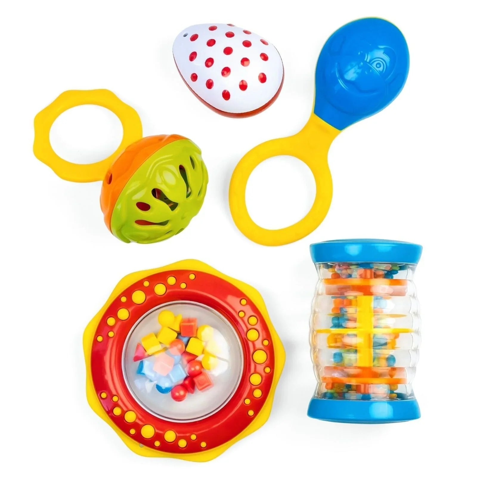 Product Pieces: 1 Rainboshaker - 1 Baby Rattle - 1 Fun Rattle - 1 Egg Shaker - 1 Baby Cage Bell