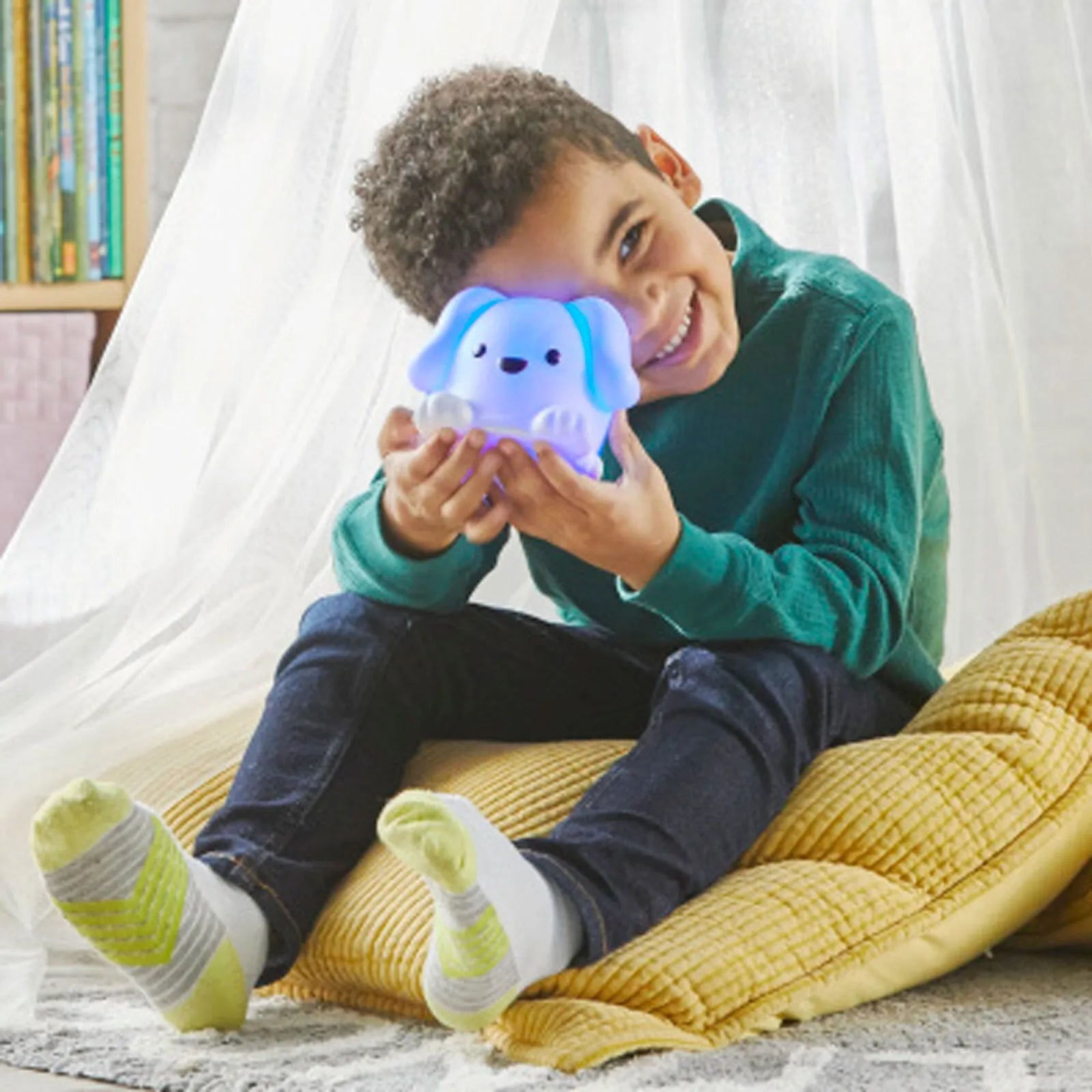 Follow along with Pawz, The Calming Pup’s guided breathing exercises for kids, inhaling as Pawz glows, and exhaling as the light dims.