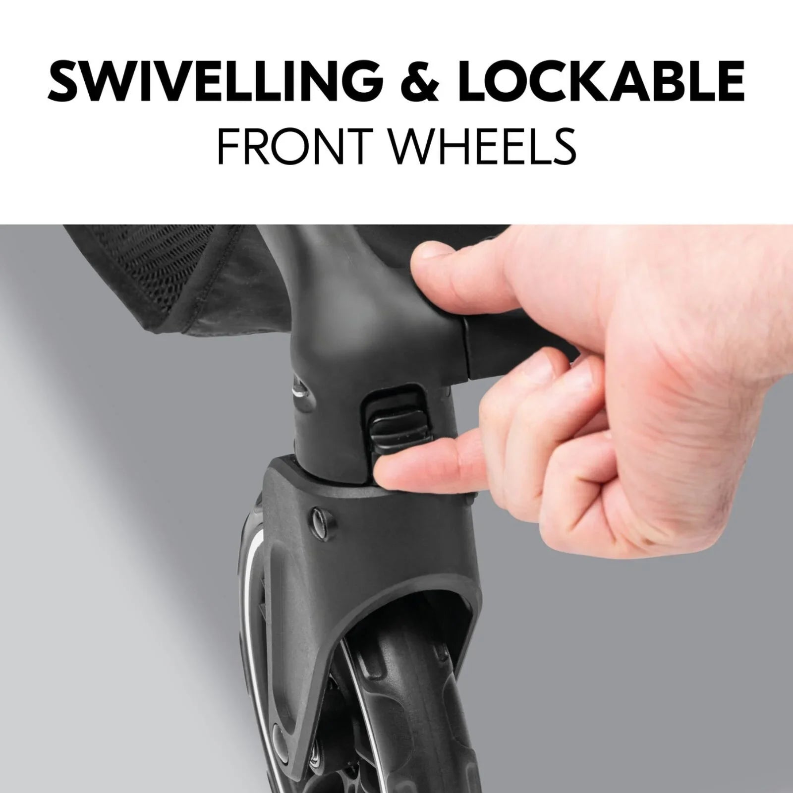 • Swivelling and lockable front wheels ensure easy steering and control.