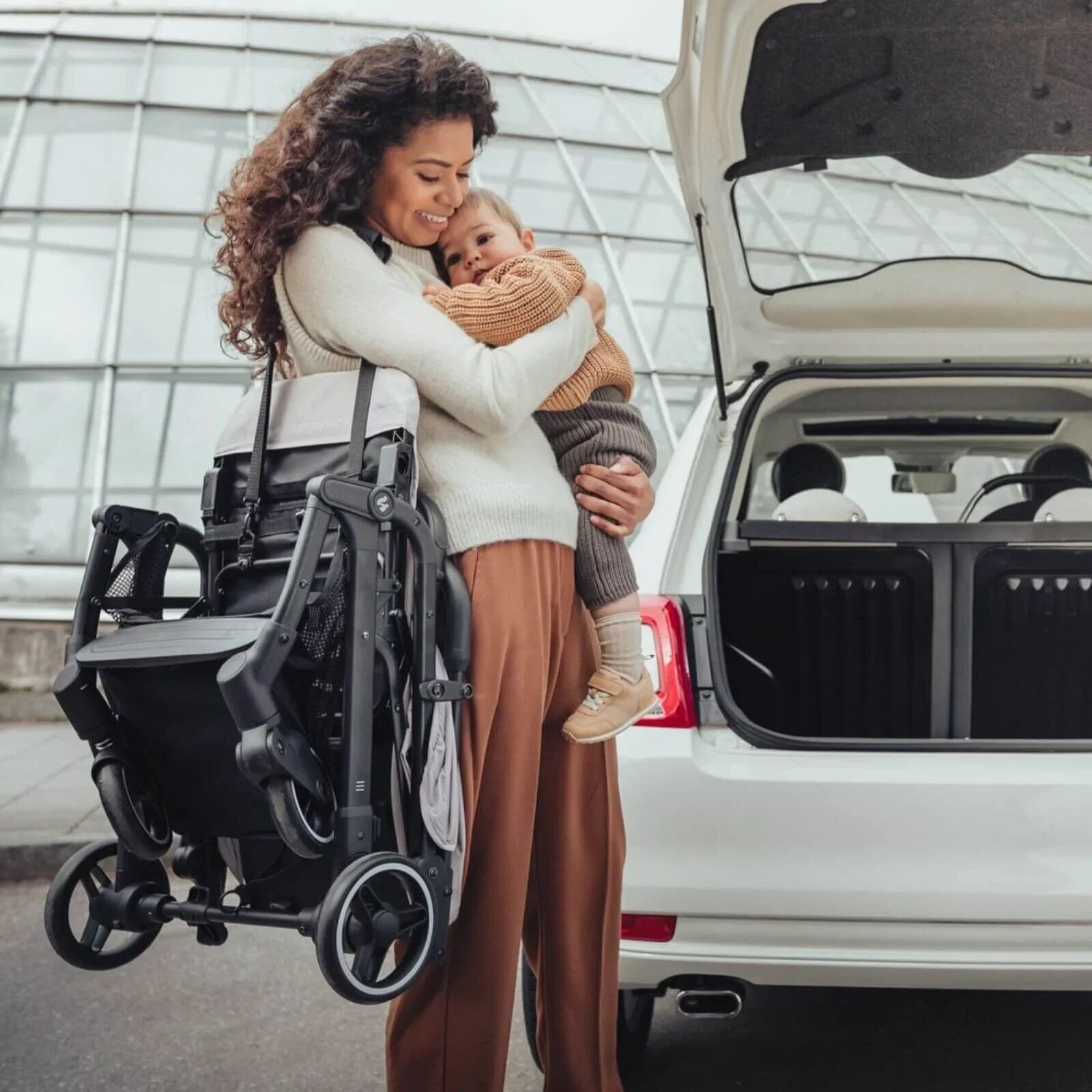Travel N Care is a lightweight, stable, and compact stroller for kids up to 25 kg. It folds easily with one hand, stands on its own with a self-closing lock for space-saving in transit, and can be carried with a padded shoulder strap. The cover is machine washable at 30 degrees for easy cleaning.