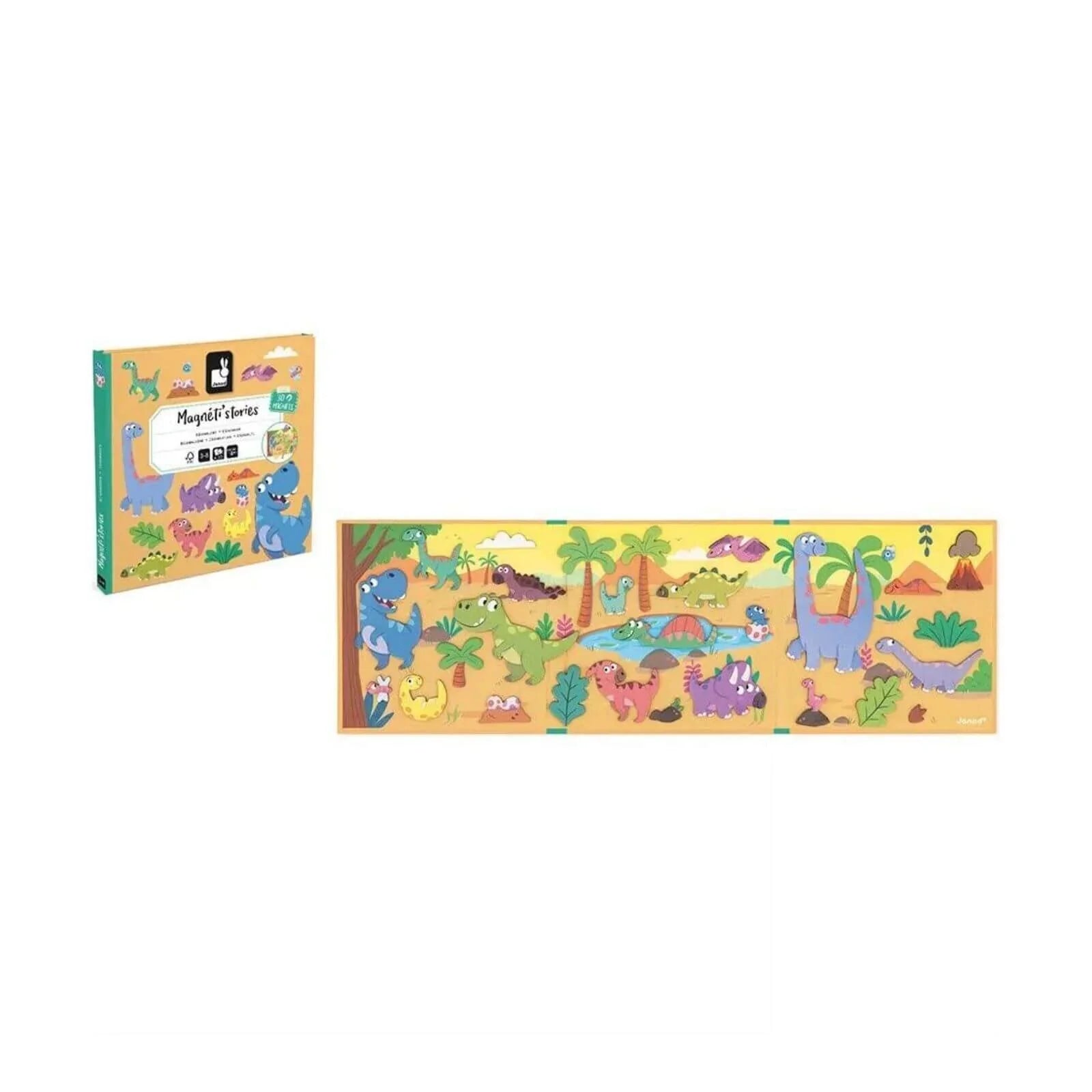 This magnetic game consists of an illustrated backdrop and 30 dinosaur-themed magnets. Your child's fine motor skills will be improved as they grasp the magnetic parts. Their imagination and creativity will be stimulated even further, as they begin to invent a whole host of stories. Stories will flow from them naturally as soon as the backdrop is stood up vertically. The birth of a little dinosaur or a volcanic eruption... the events are in your child’s hands. Practical, foldable and therefore easily transportable, your child will never want to part with it! This magnetic game is part of the large Magnéti'stories collection which effectively promotes imagination and daydreaming. The magnetic game is made from FSC™-certified cardboard and controlled mater