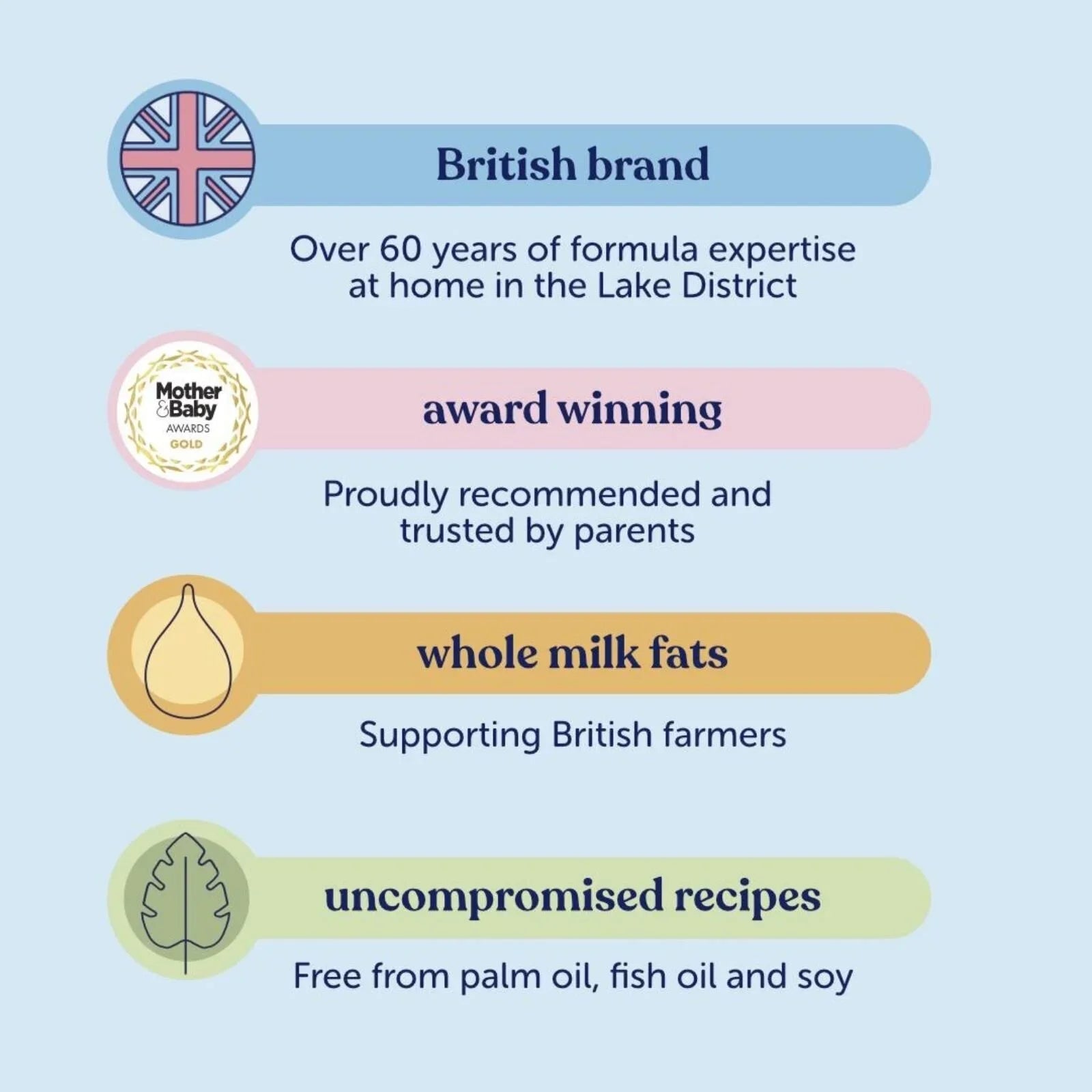 It is 100% British brand and don’t do palm oil, fish oil or other cheap additives. What we do do is locally-sourced whole milk, plant- based DHA and 3’-GL. Simple.