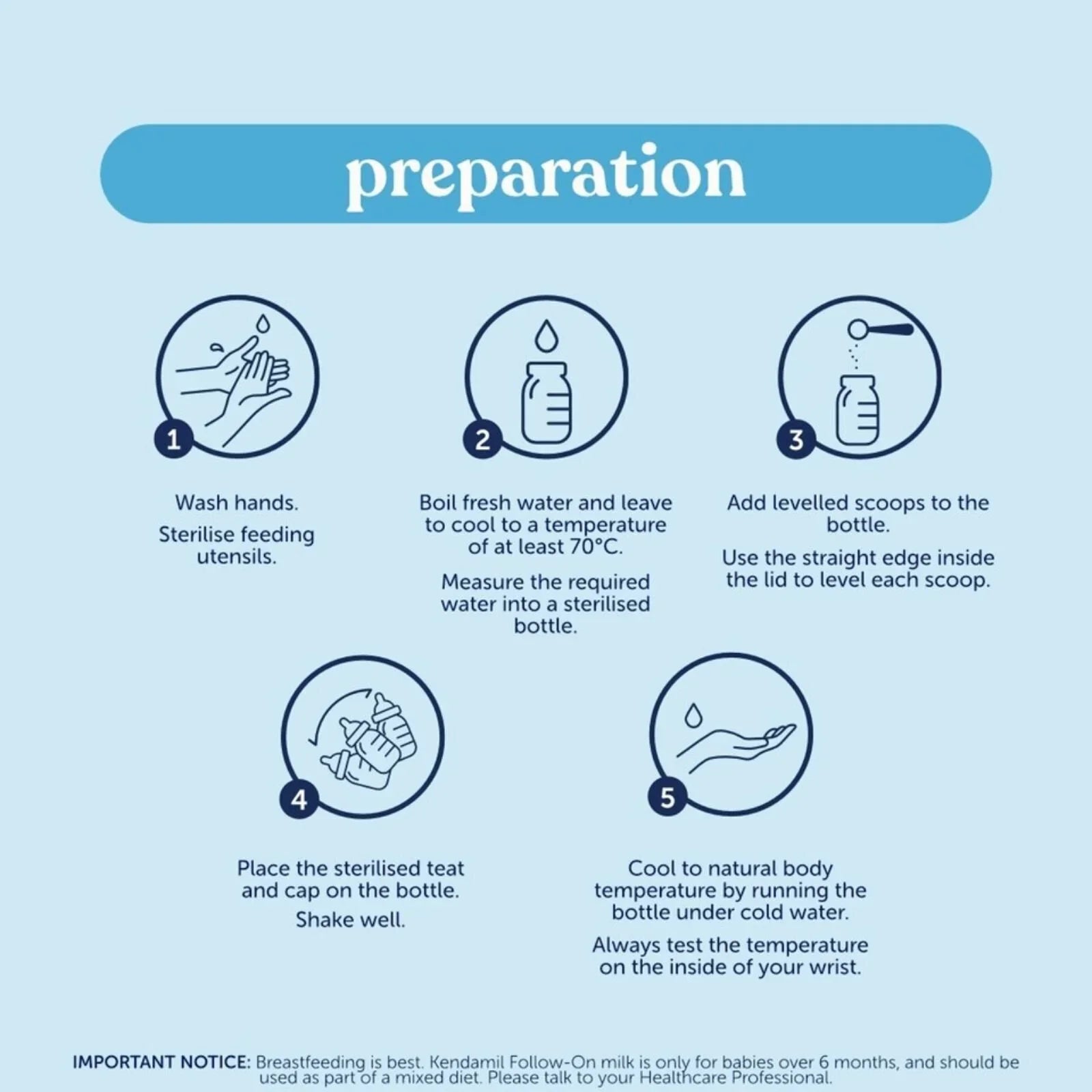 For feeding your baby, add 1 level scoop of powder to each 30 ml of water (freshly boiled and cooled). Please refer to the feeding guide shown below and note this table should only be used as a guide. All babies are different and may require more or less than is shown. Kendamil Toddler Milk should be fed on demand. If you need more advice talk to your healthcare professional.