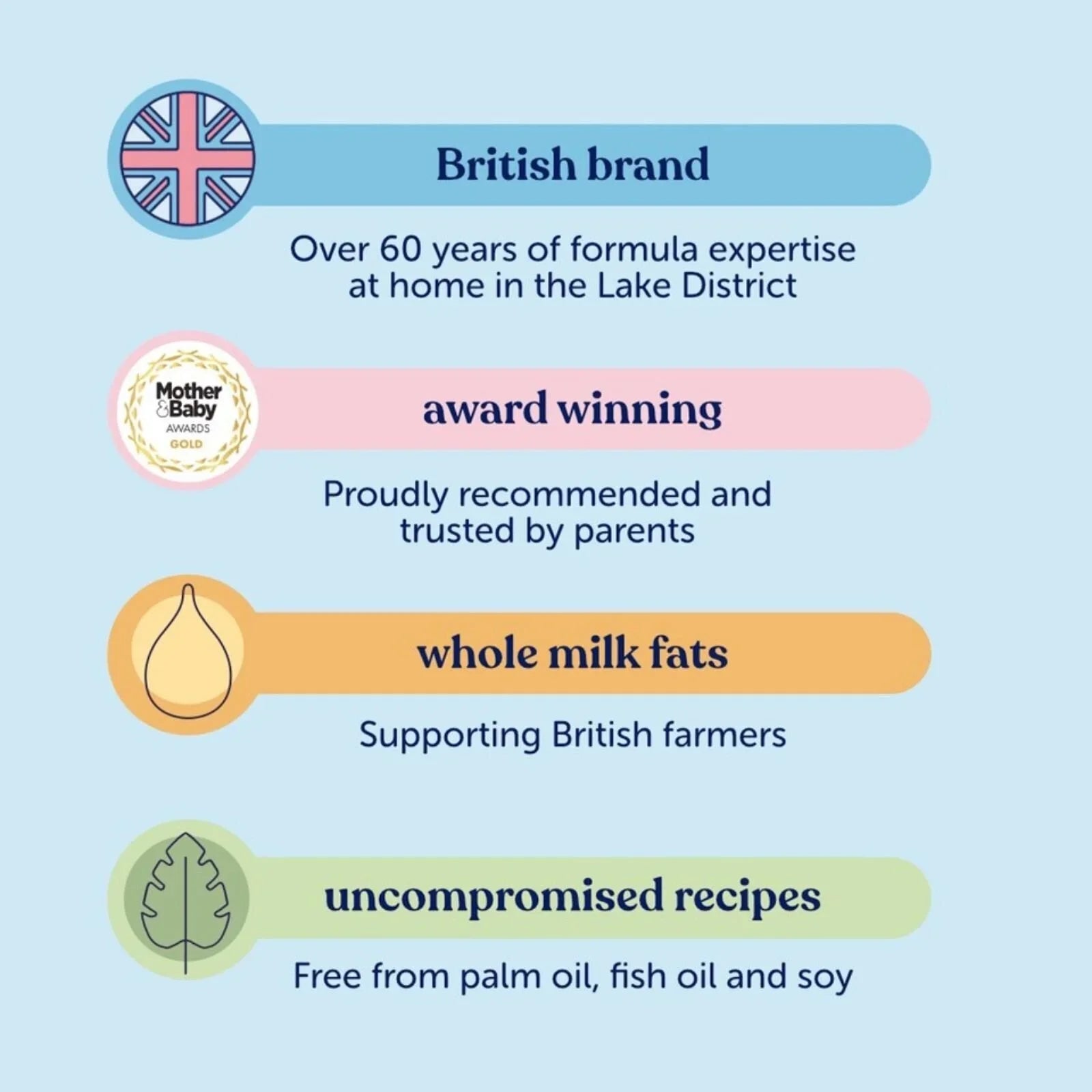 We’re 100% British brand and don’t do palm oil, fish oil or other cheap additives. What we do do is locally sourced whole milk, plant- based DHA and 3’-GL. Simple.
