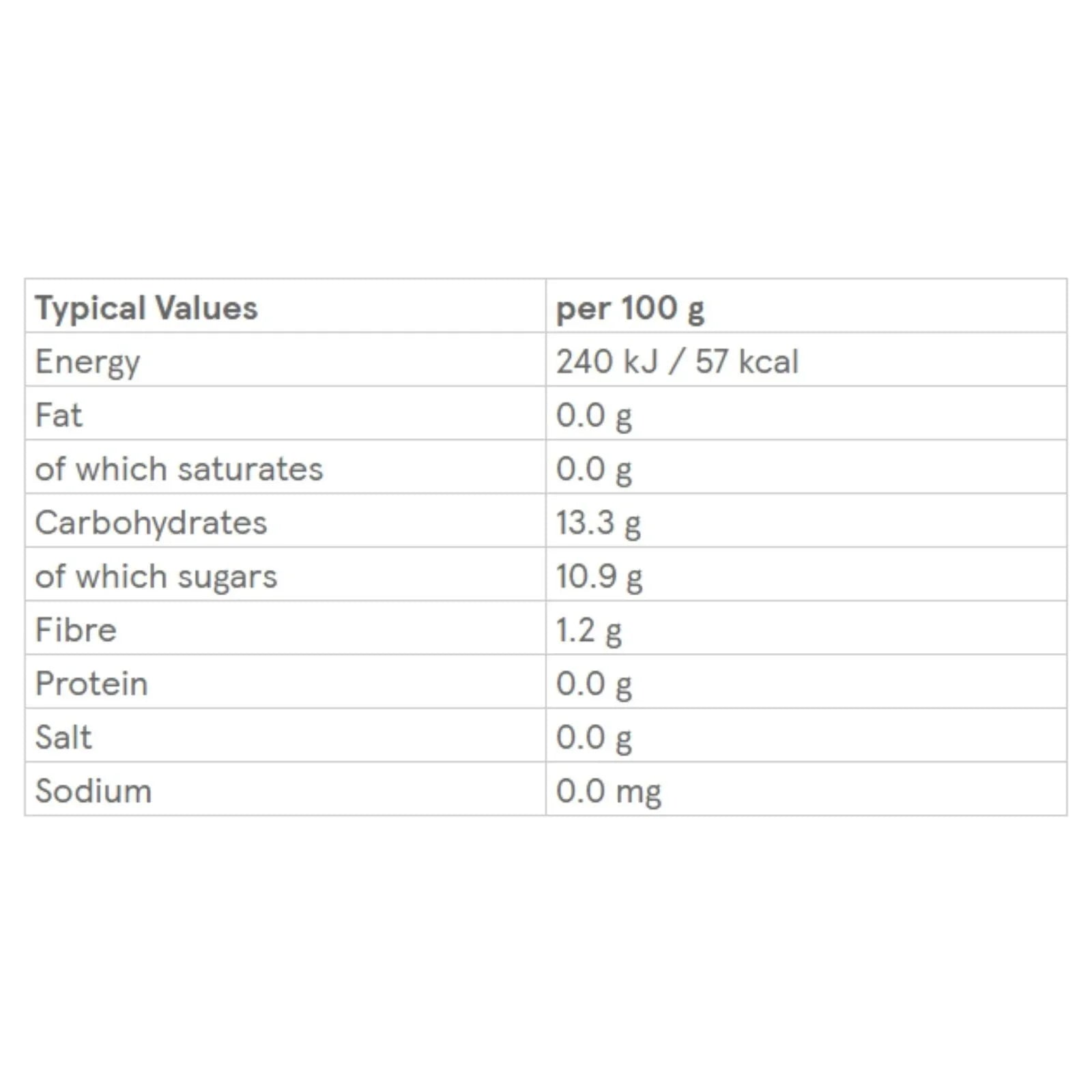 Nutritionals: Energy 240KJ/57kcal, Fibre 1.2g, Fat 0.0g, Protein 0.0g, of which saturates 0g, Salt 0.0g, Carbohydrates 13.3g, of which sugars 10.9g.