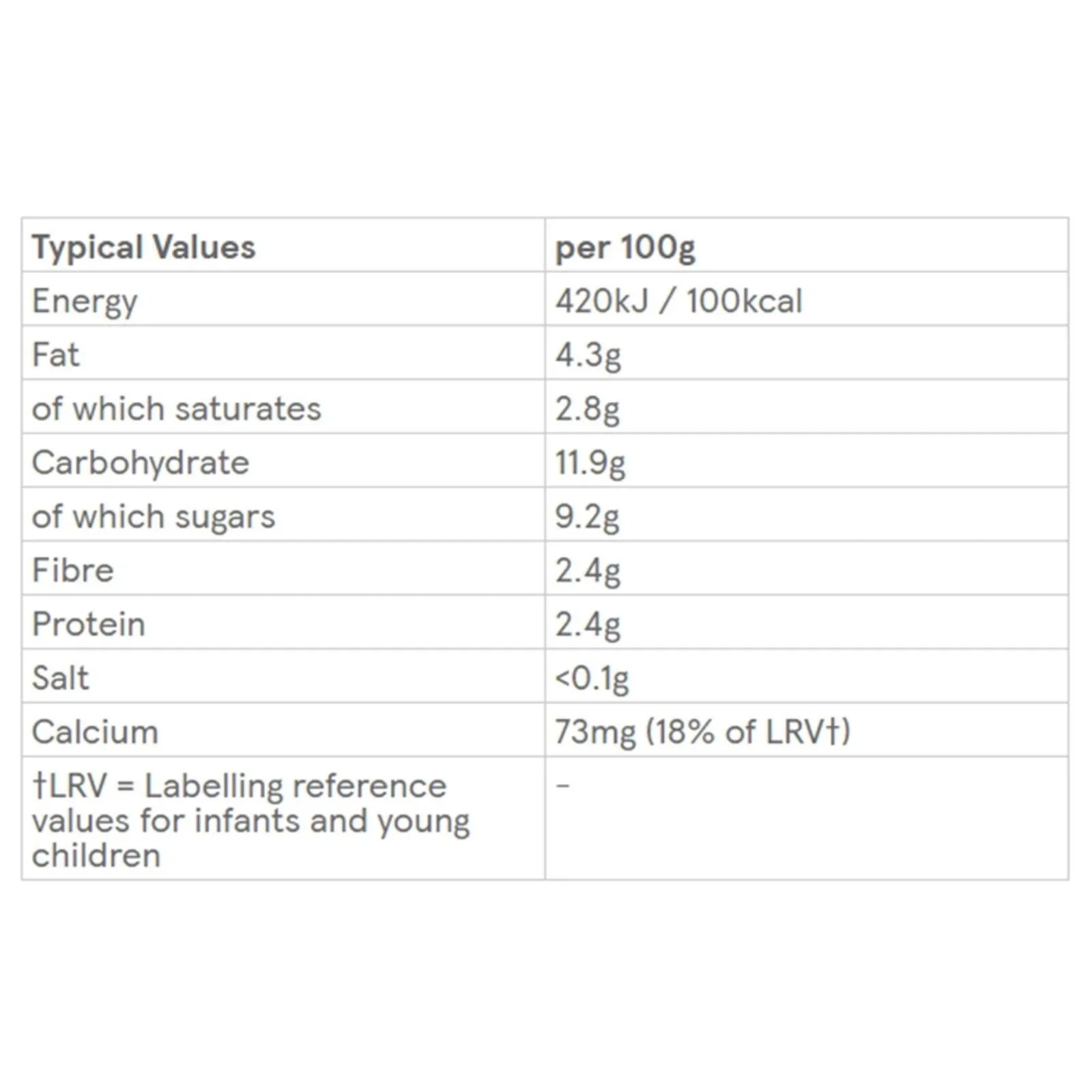 Nutritionals: Energy 420kJ/ 100kcal, Fibre 2.4g, Fat 4.3g, of which saturates 2.8g, Protein 2.4g, Salt <0.1g, Carbohydrates 11.9g, of which sugars 9.2g, Calcium 73mg (18% of LRV+), +LRV = Labelling reference values for infants and young children.