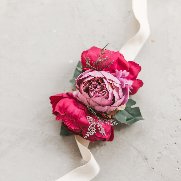 This fuchsia-lilac boho-style floral garland is made from artificial peonies and some greenery, perfect for decorating a teepee, nursery, or even for weddings. Its vivid, beautiful colors make it a lovely addition to any space.