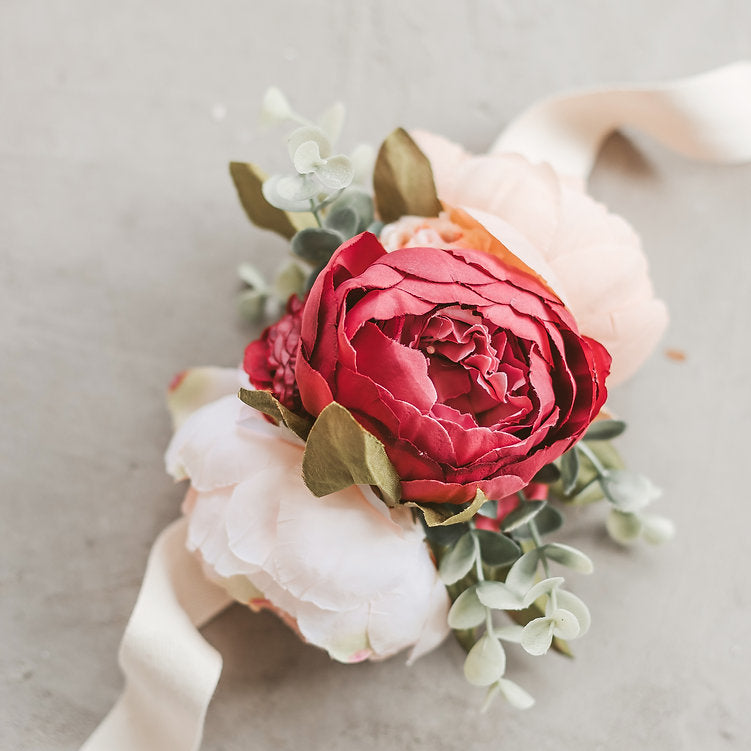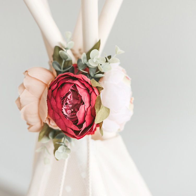 This cute boho-style floral garland is made from artificial peonies and some greenery, perfect for decorating a teepee, nursery, or even for weddings. Its soft, beautiful colors make it a lovely addition to any space.