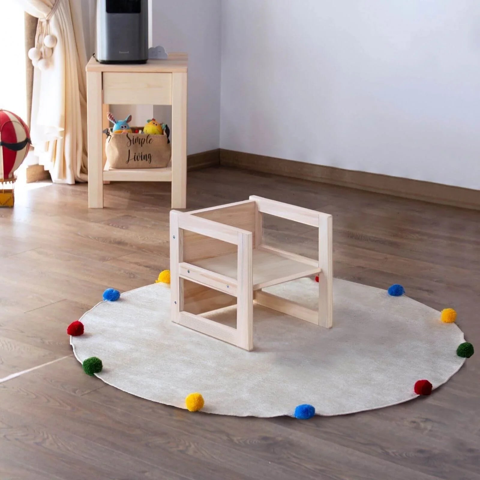 Crafted from solid wood, this convertible piece seamlessly transforms from stool to table, offering years of functionality and style. Its timeless appearance blends effortlessly into any corner of your child's room.