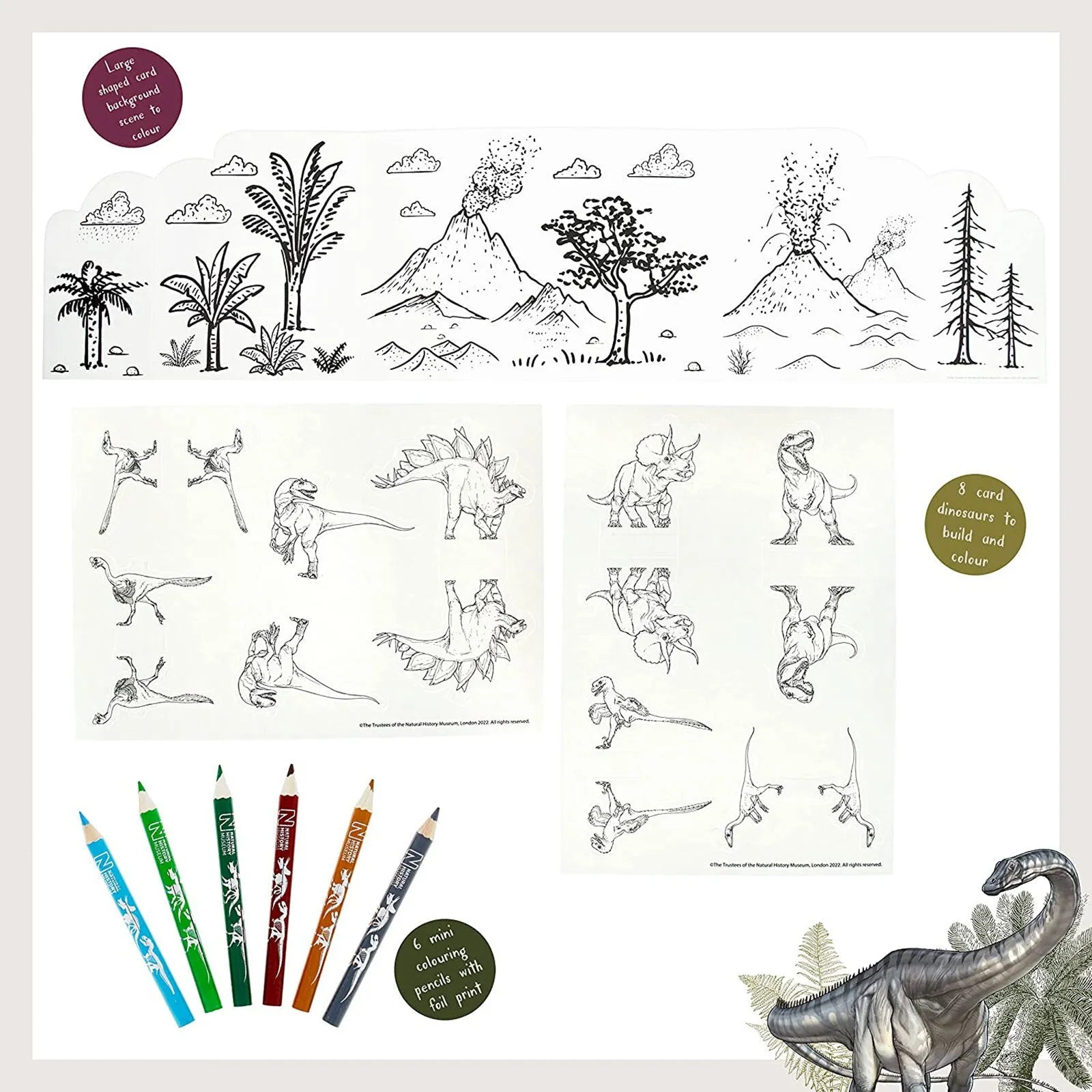 - Large die cut stand up card scene with 8 die cut dinosaurs to build and colour, made from recycled paper and card 6 colouring pencils and dinosaur game
