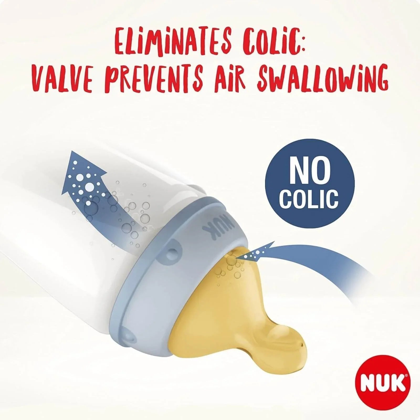 The First Choice+ Teat replicates a mother's nipple during breastfeeding. The extra soft tip easily takes on different shapes whilst also promoting the development of the mouth, lips and tongue. The orthodontic NUK shape, combined with the NUK First Choice+ extra wide lip support, makes it easier to alternate between breast and bottle feeding. Clinically proven for optimal combination of breast and bottle feeding* Improved Anti Colic Air System minimises infant colic caused by the harmful swallowing of air. Medium feed hole for milk and formula. Latex is a softer, more flexible and natural material which can make it easier for some babies to adapt to, it is also more bite resistant.