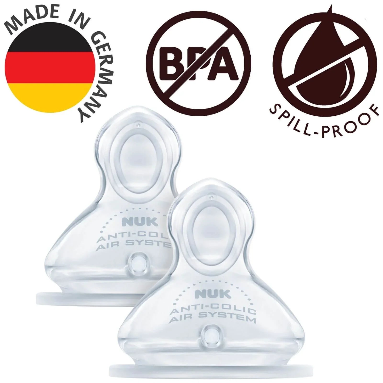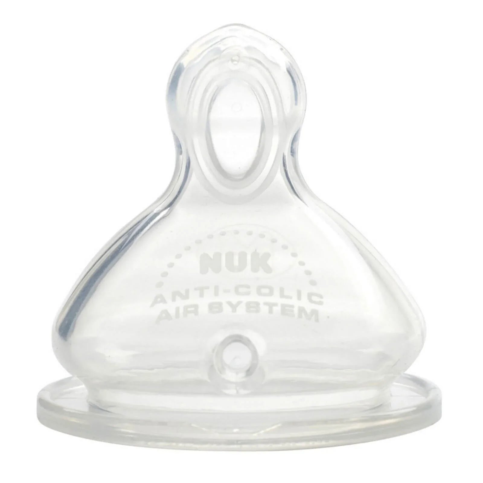 NUK First Choice+ Teats replicate the shape of a mother's nipple during breastfeeding. The extra soft tip easily takes on different shapes whilst also promoting the development of the mouth, lips and tongue. The orthodontic NUK shape, combined with the NUK First Choice+ extra wide lip support, makes it easier to alternate between breast and bottle feeding. The improved Anti Colic Air System minimises infant colic caused by the harmful swallowing of air.