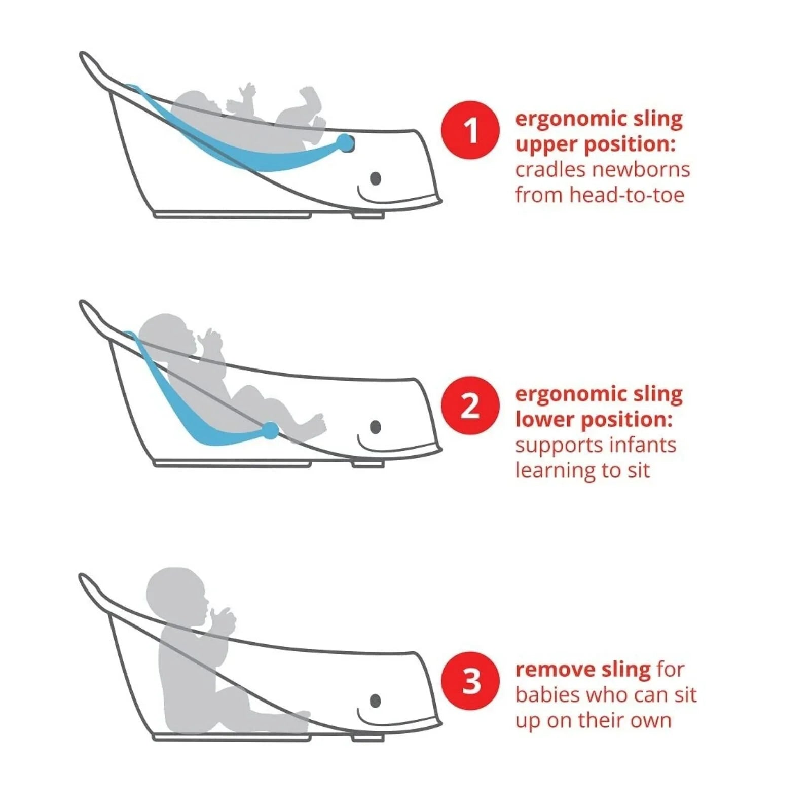 Skip Hop Moby Smart Sling 3-Stage Baby Bath Tub, shaped like a cheerful whale in Baby Beluga white, adapts to three stages of your baby's growth with Smart Sling™ support. Its ergonomic design provides full-body or seated support with quick-drying mesh and comfort-edge construction. As your baby learns to sit, the sling adjusts to a cushioned seat, and once mastered, the spacious tub offers a comfortable and bump-free bathing experience.
