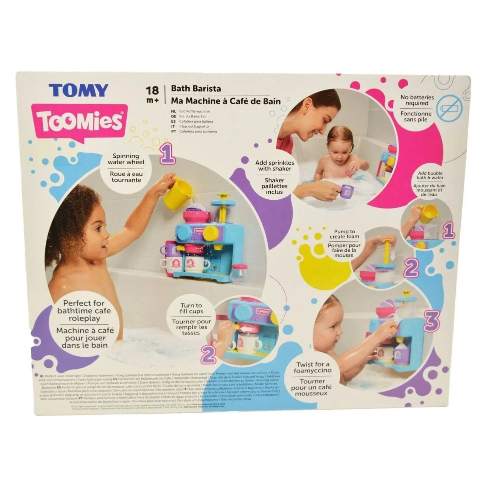 Water Play Baby Toys: Babies 18 months and up will love brewing make-believe cappuccinos using Toomies Bath Barista toy coffee machine with pump action frother and water sprinkler - just add soap and water for instant bubble bath coffee-making fun! Includes 3 cups, 1 jug, 1 shaker.