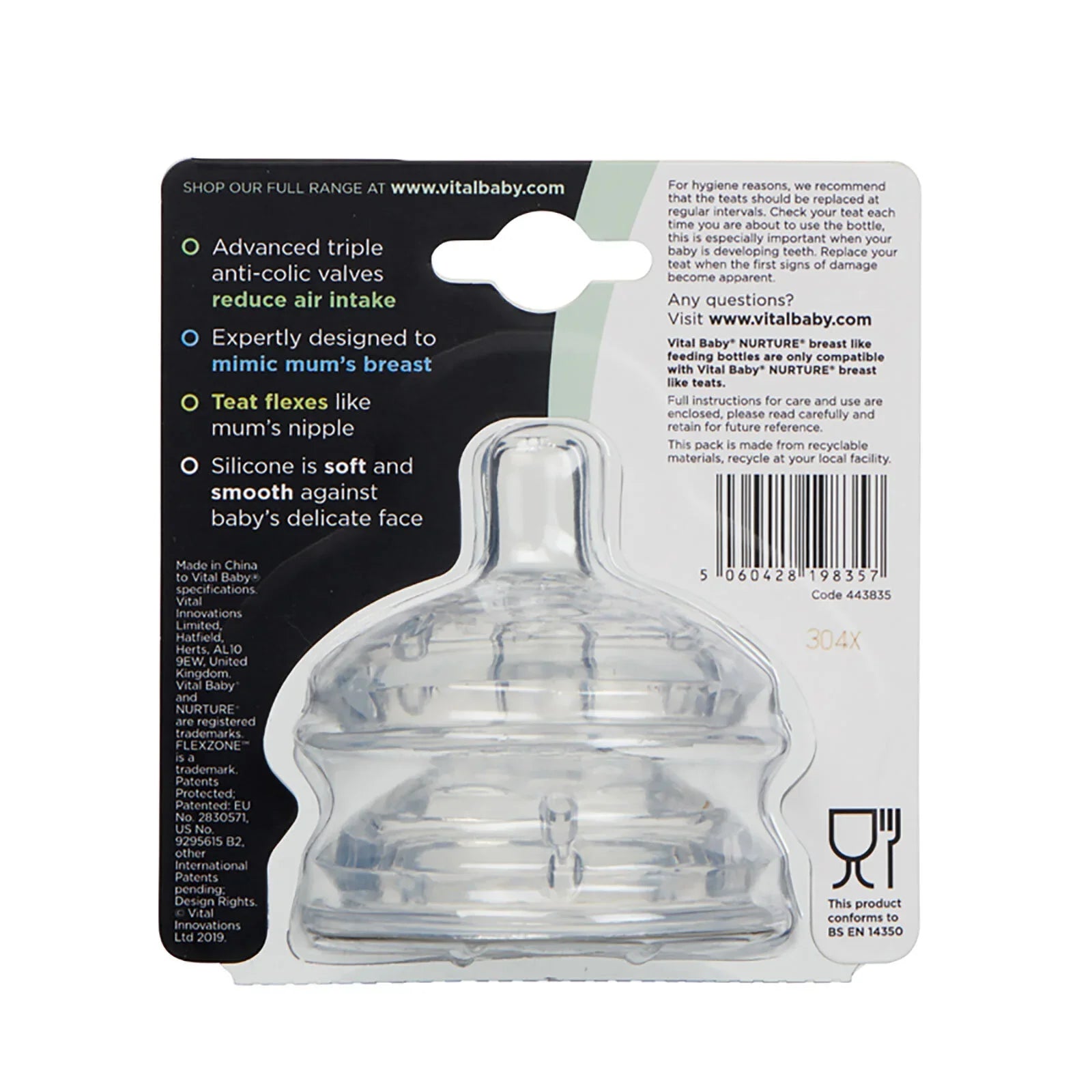 Designed to mimic the shape and feel of mum’s breast NURTURE breast-like feeding teats; have advanced triple anti-colic valves that reduce air intake and help to reduce the symptoms of colic; Made from 100% super-soft silicone; the flexion area around the bottle teat allows the teat to stretch and flex just like mum’s breast, to avoid confusion between breast and bottle and ensure a comfortable and effective feed for your baby.