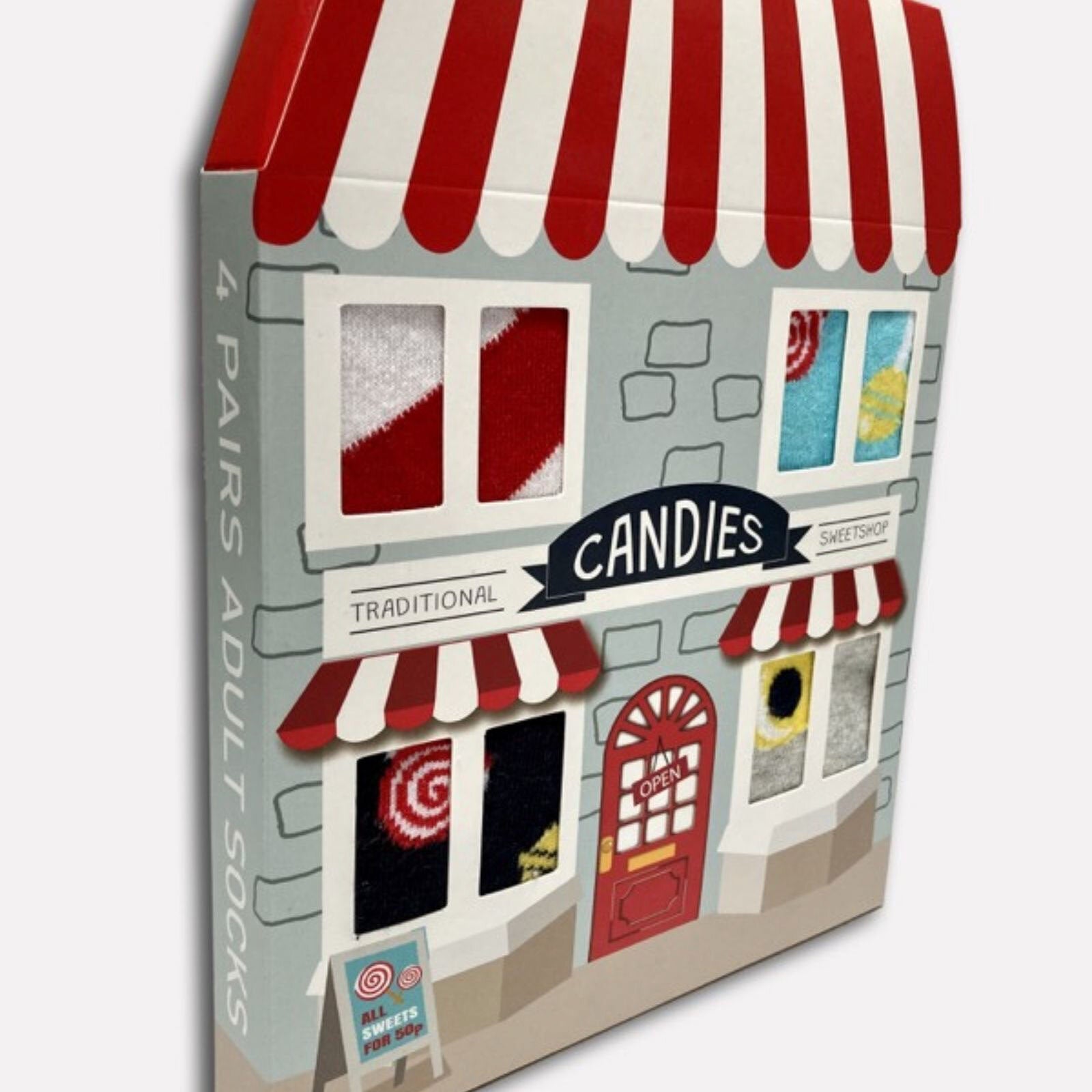 - Four sweetie themed socks in a retro sweet shop gift box.