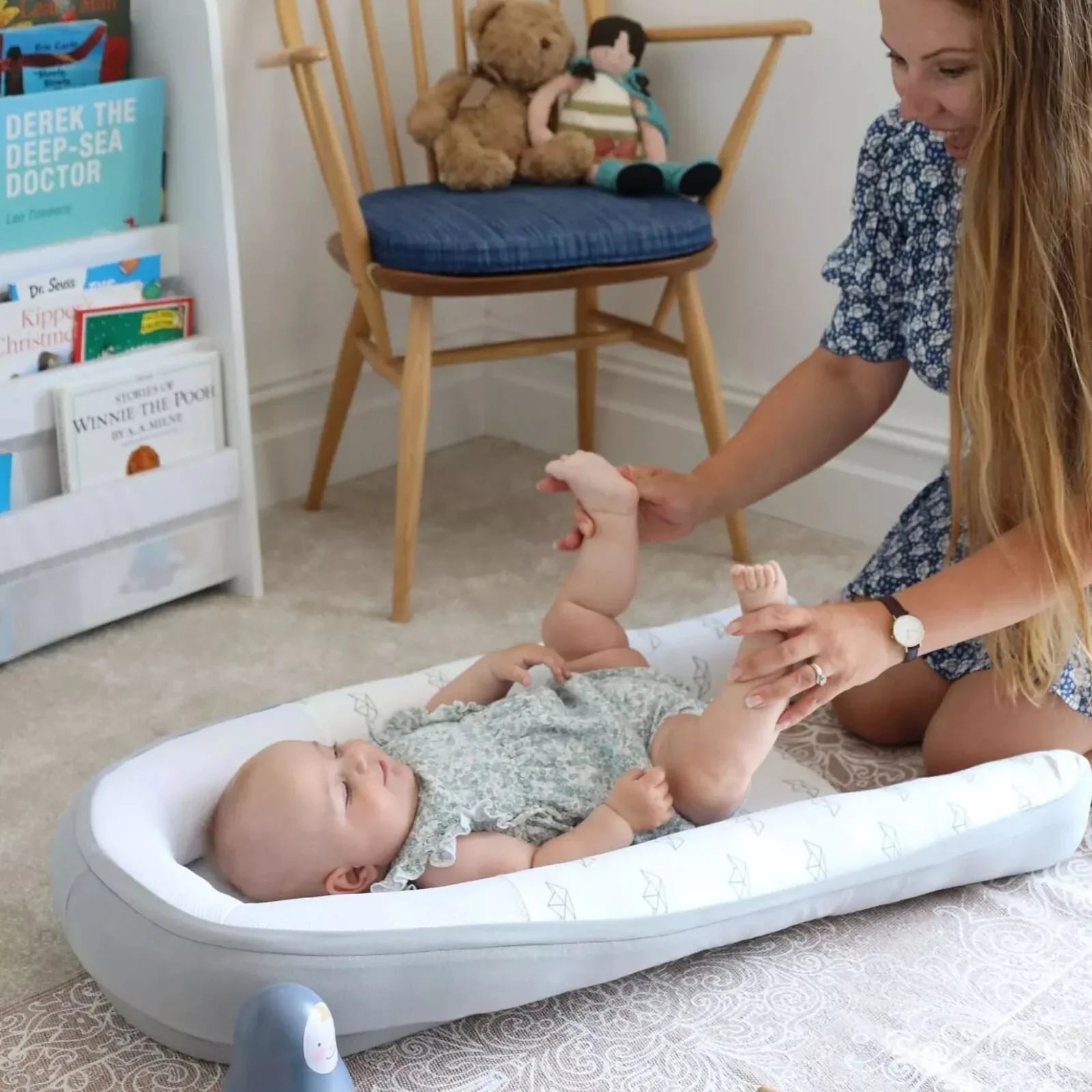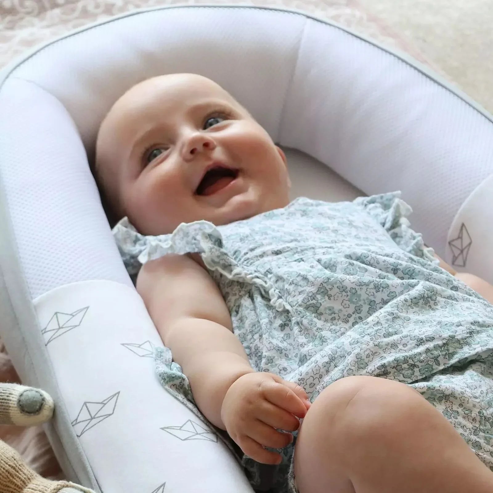 Doomoo Cotton Cocoon - Origami Boats provides a safe, comfortable, and breathable space for your baby. Designed to support the transition from the womb to the outside world, this nest features a soft organic cotton cover, micro-breathable 3D fabric for ventilation in the head area, and an adjustable Velcro bottom to grow with your baby. Ideal for co-sleeping, tummy time, and independent sleep, this design offers comfort and security for newborns up to 8 months. It also comes with a removable and machine-washable cover for easy cleaning.