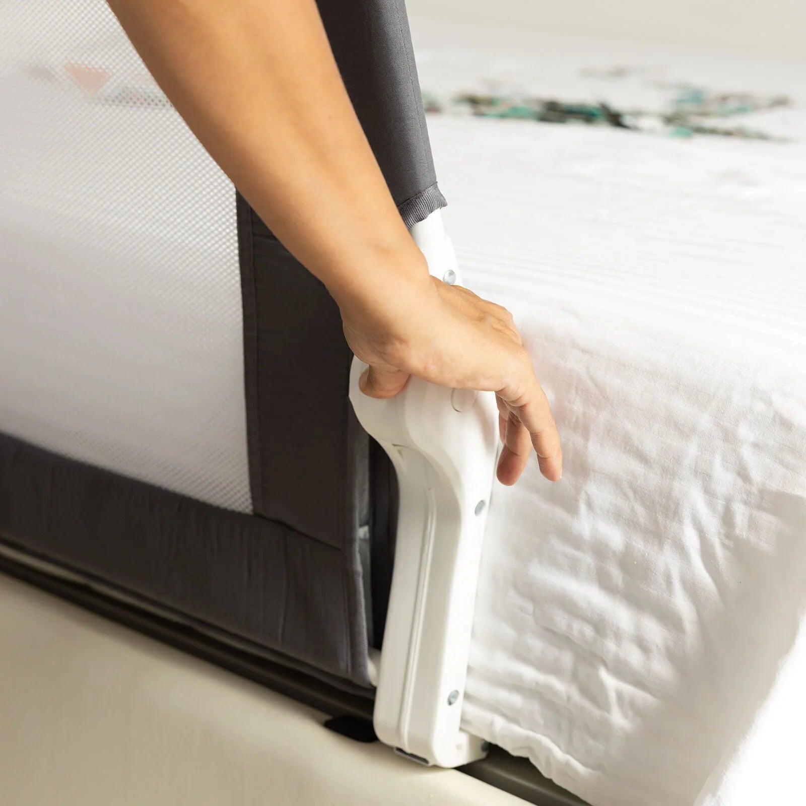 • Once you have placed the baby plus extra wide safety bed rail, secure the bed rail in place. Most bed rails have straps or anchors that attach to the bed frame or mattress for stability. Make sure the bed rail is securely fastened to prevent it from moving or shifting during use.