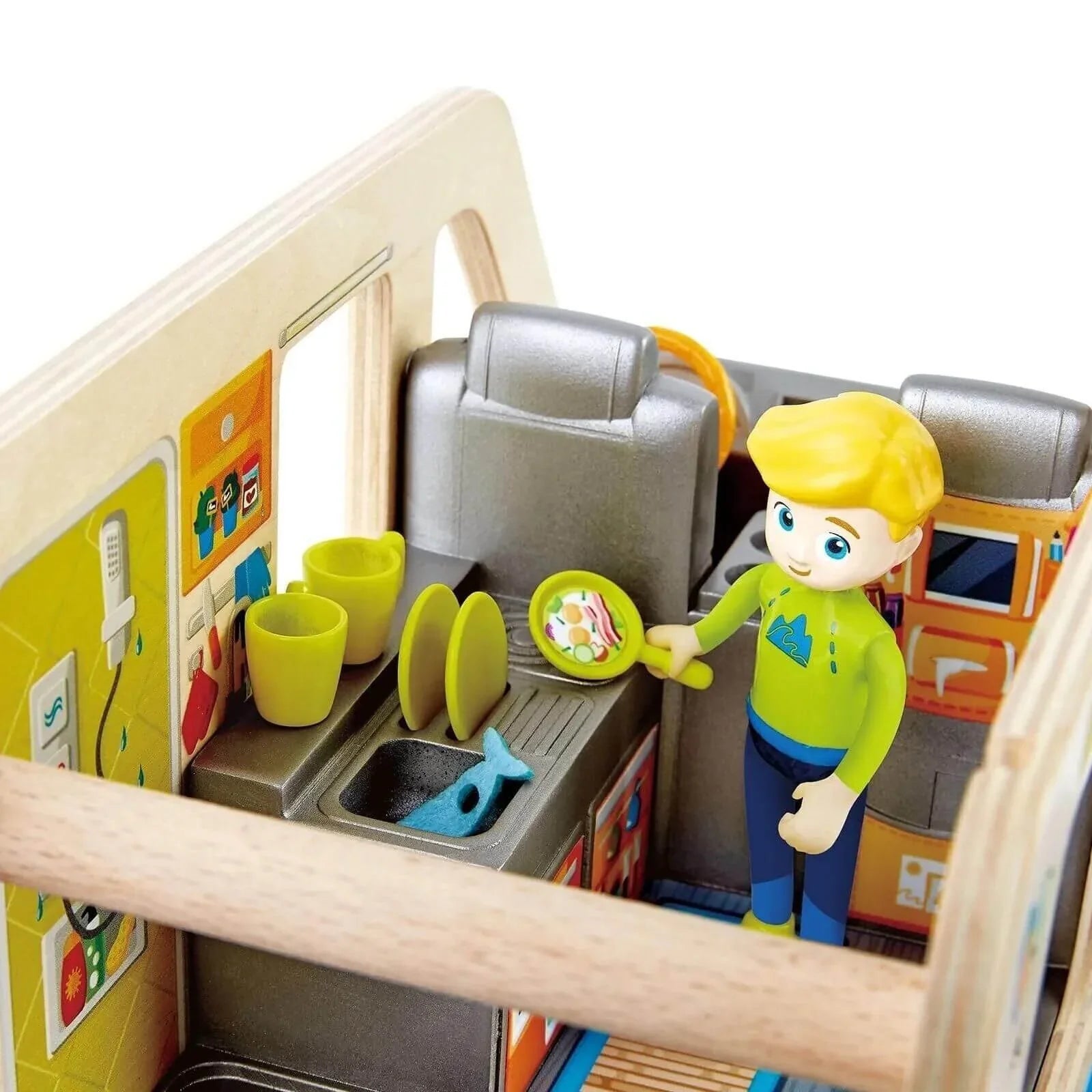 ALL IN ONE PLAYSET: This wooden 23 piece camper van with dolls has everything they need for their trip. Head out for an amazing camping adventure! Includes a campfire, a picnic set for two, 3 navigation cards, 2 surfboards, a hang-glider and cooking accessories