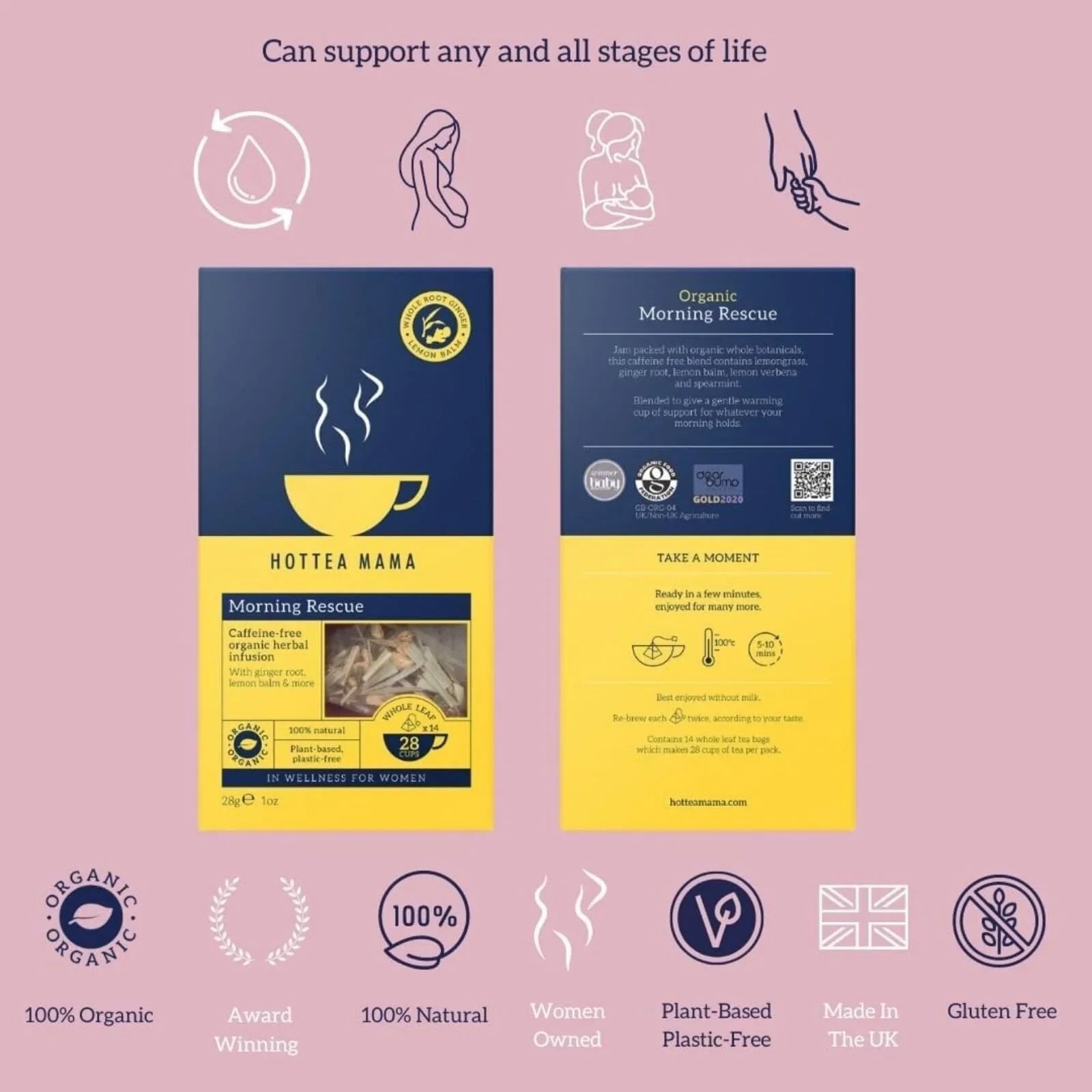 HotTea Mama Organic Morning Rescue is here for you on tough mornings! This award-winning, caffeine-free herbal tea is crafted with ginger, lemongrass, lemon balm, lemon verbena, and African mint, helping to soothe your stomach and calm your mind.