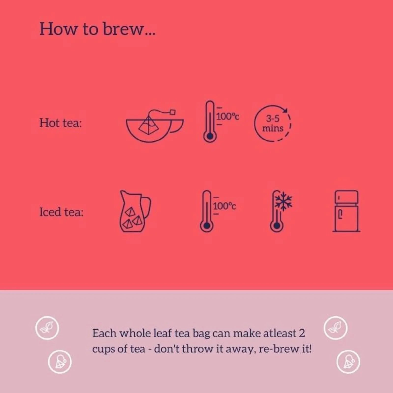 Made with 100% organic, plastic-free, and biodegradable tea bags, it is both environmentally friendly and good for your well-being. It can be enjoyed hot or cold, and each bag makes two cups of tea, allowing you to savour it for longer.