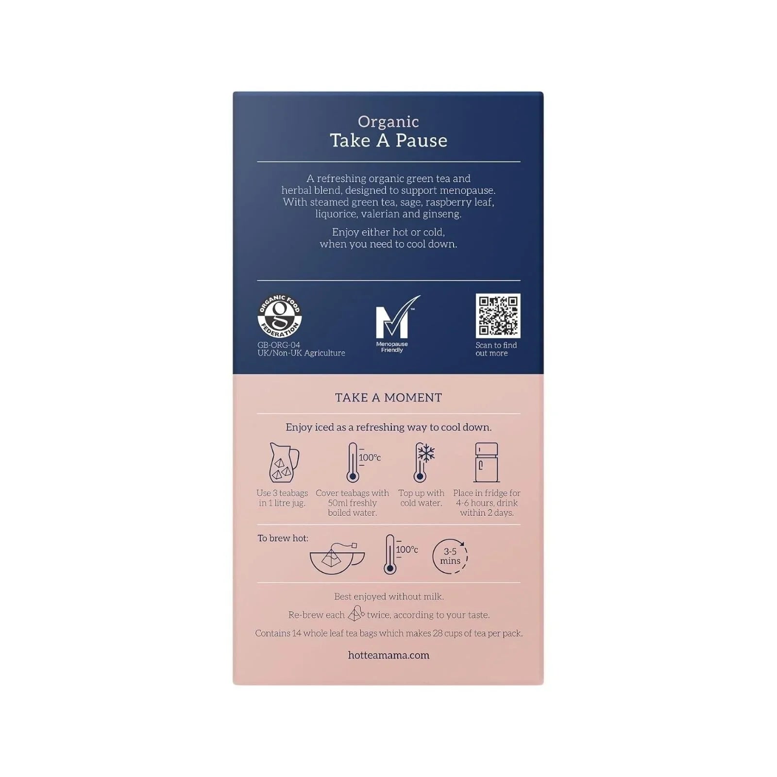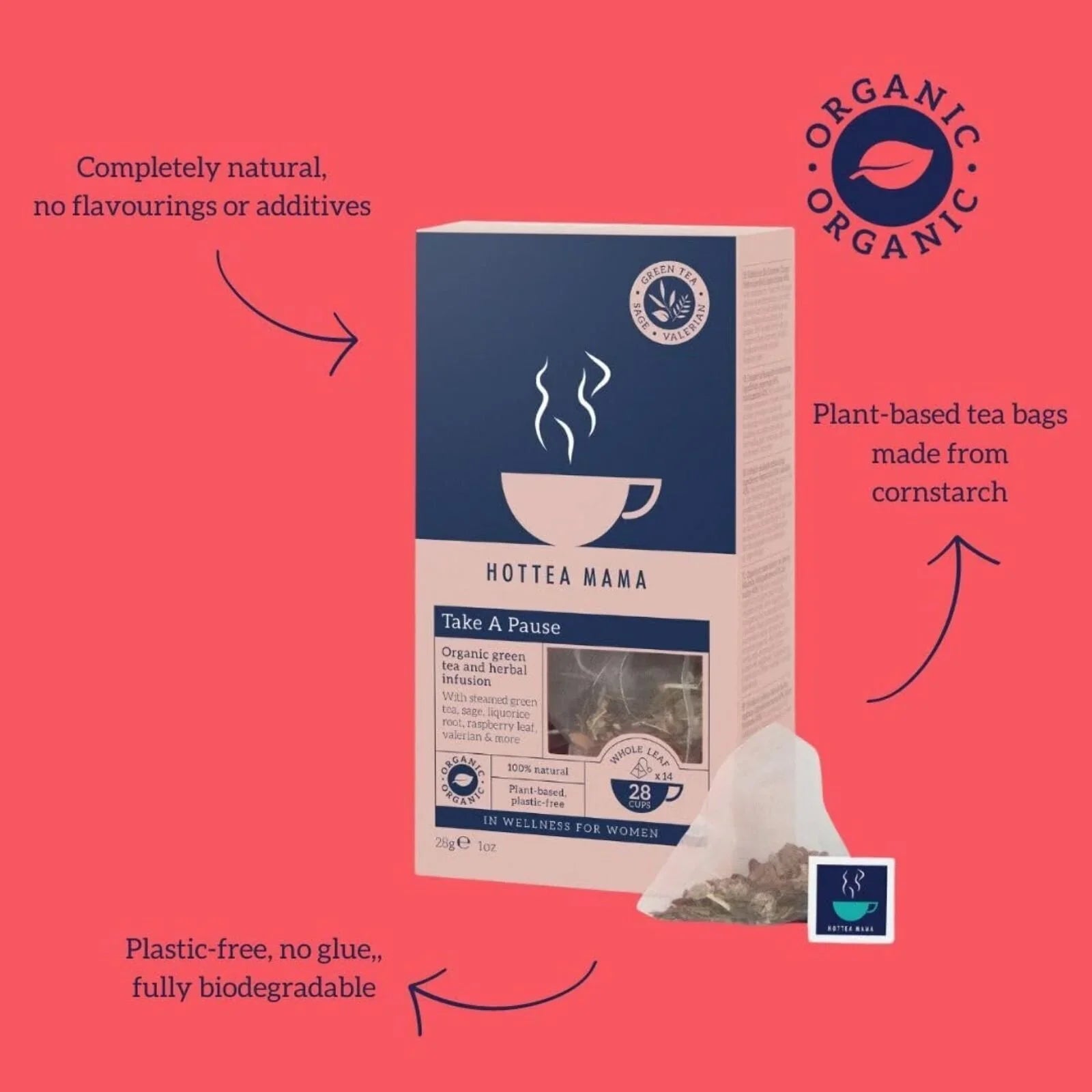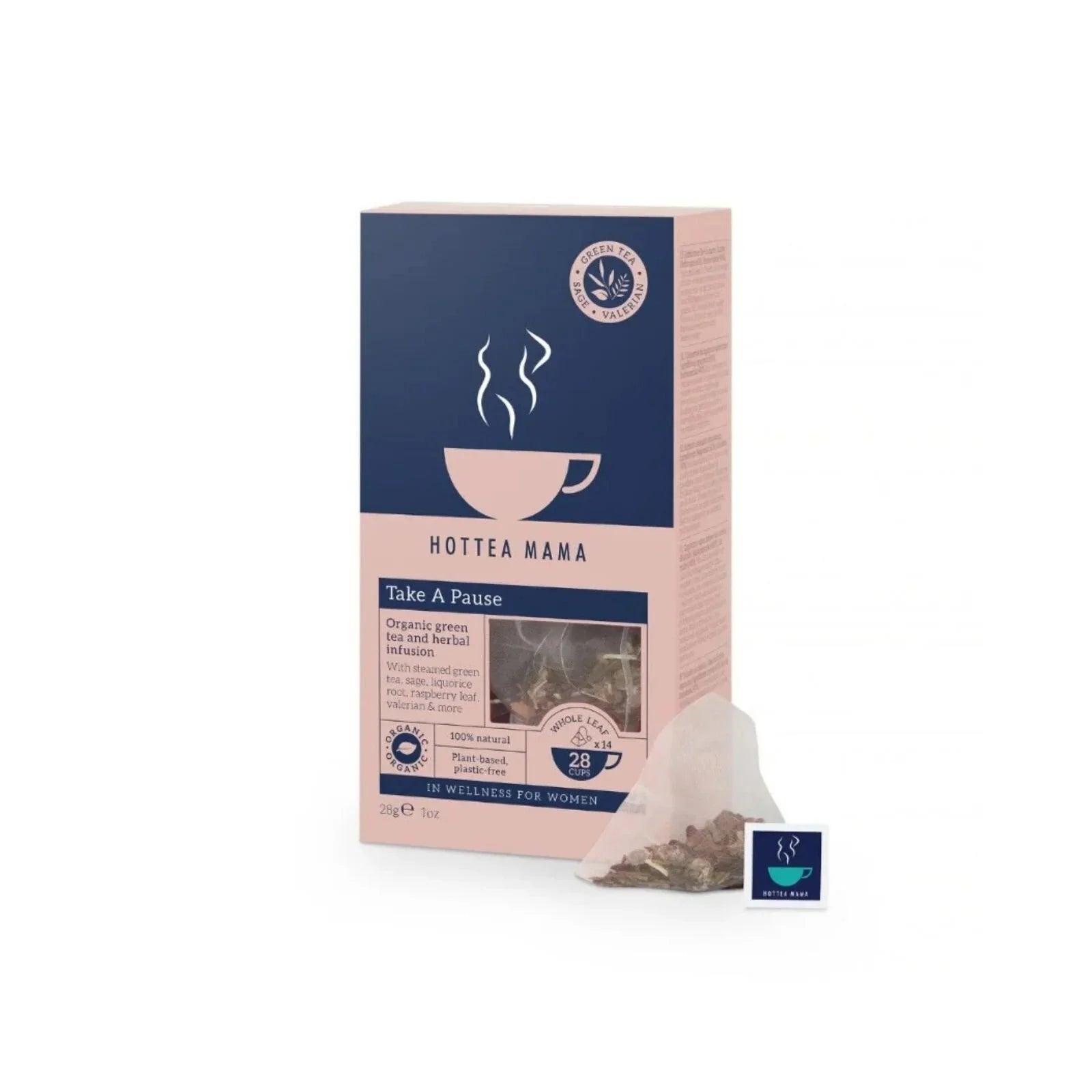HotTea Mama Organic Take A Pause is specially crafted to support your body during menopause and perimenopause. Steamed green tea provides a gentle caffeine lift, while raspberry leaf, ginkgo biloba, ginseng, valerian, sage, and liquorice work together to help ease hot flushes, brain fog, stress, and sleep disturbances.