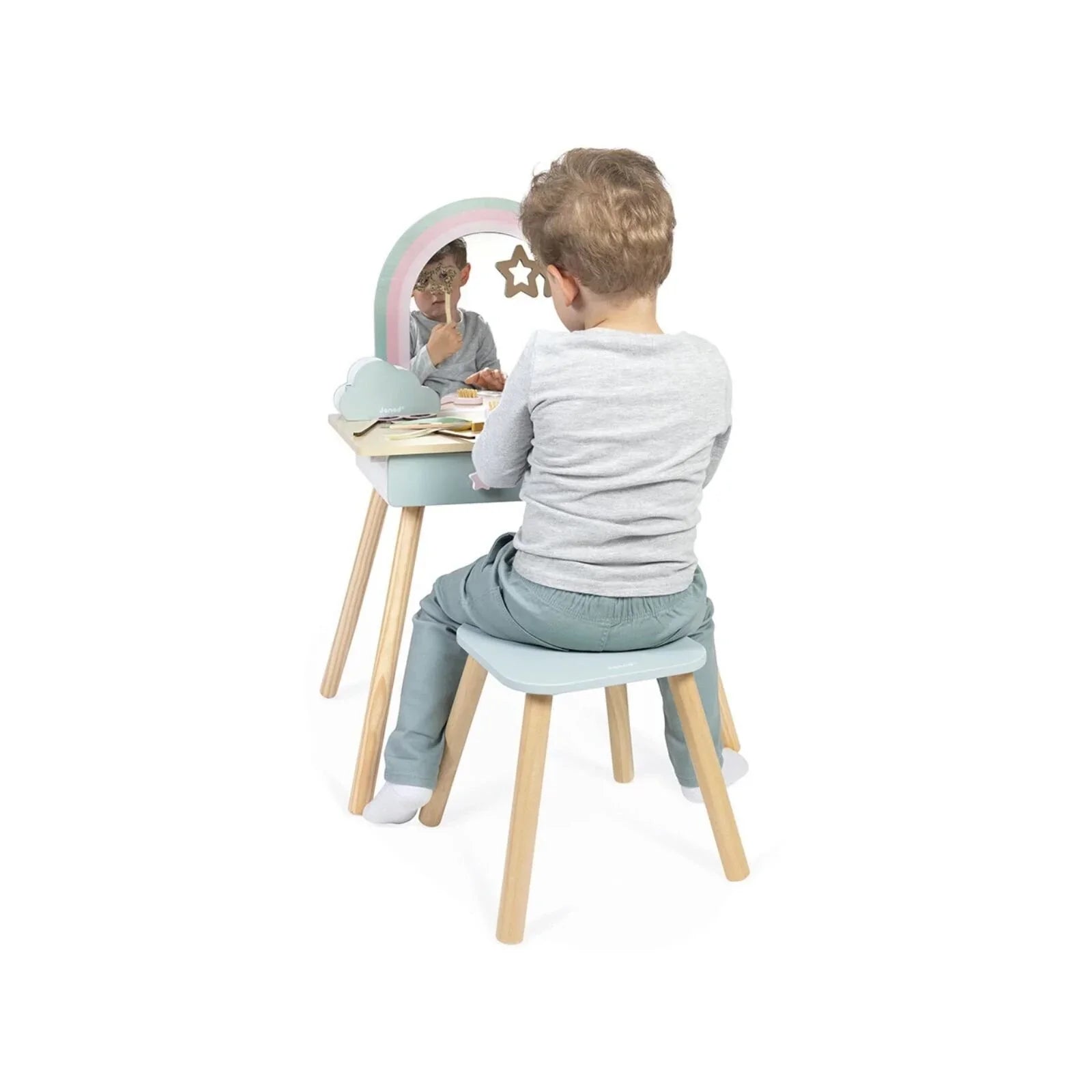 Janod Wooden Dressing Table is a magical play space for little dreamers, featuring a rainbow mirror, secret magnetic compartment, elegant wooden design and a full 10-piece accessory set. Decorated with a whimsical unicorn theme, this charming vanity encourages self-expression with fun extras like a hairbrush, magic wand, photo booth props and magnets. Made from FSC-certified wood, it’s as kind to the planet as it is enchanting in a child’s room. Both decorative and educational, it’s a delightful way to combine imagination and style!