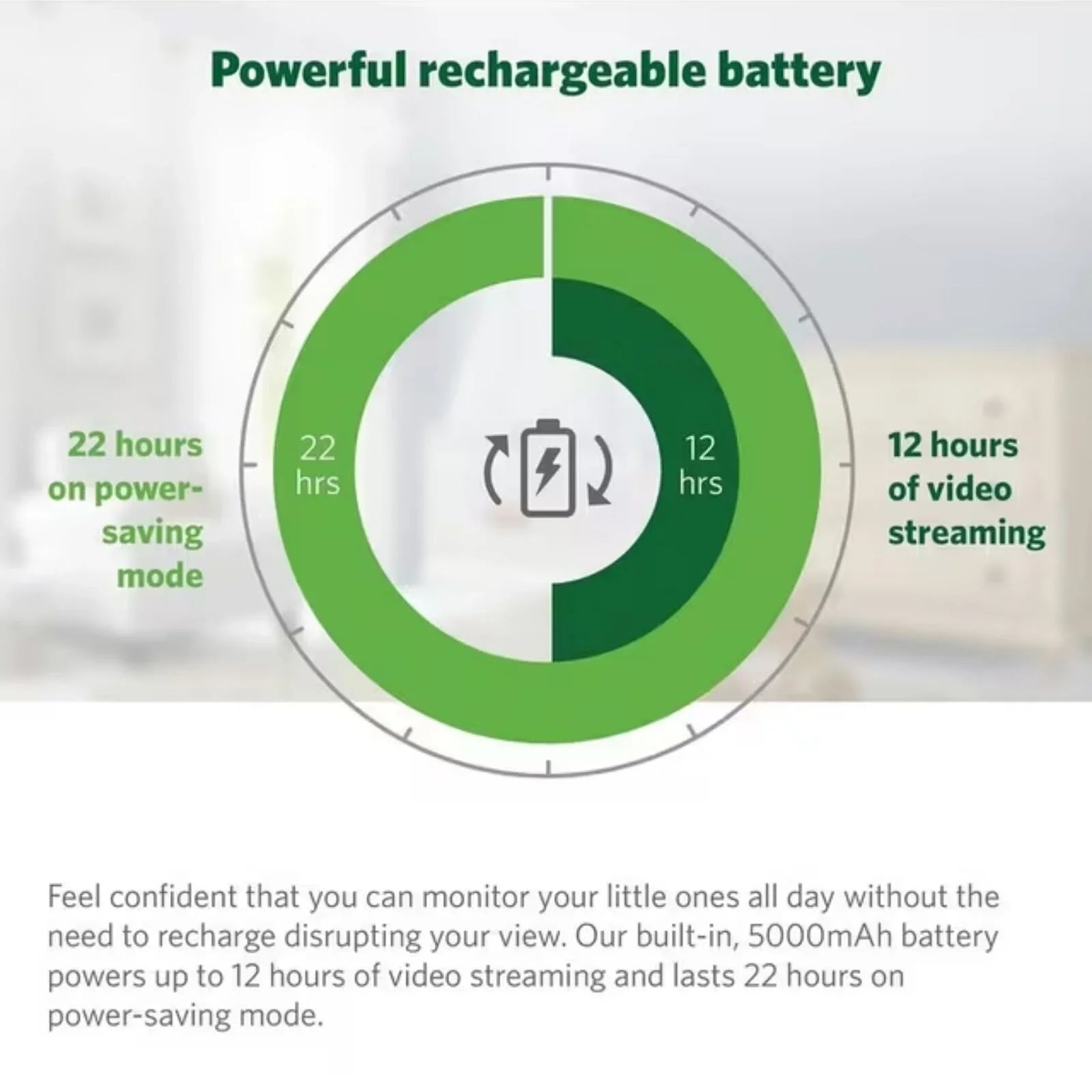 • Battery: 5000mAh rechargeable battery offering up to 12 hours of video or 24 hours of audio monitoring.