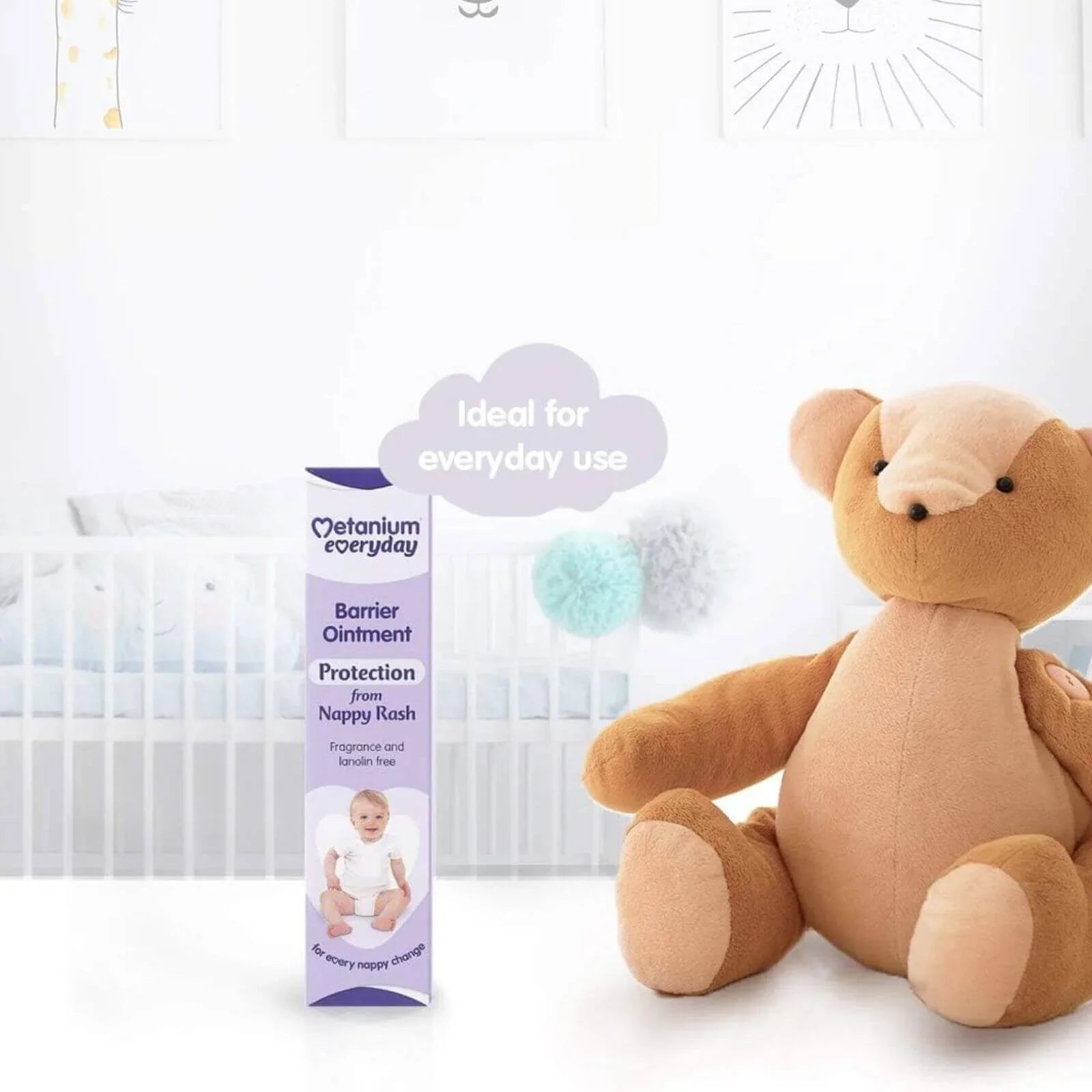 Metanium Everyday Barrier Ointment cares for delicate skin by forming a barrier to help protect against external irritants that can cause nappy rash.