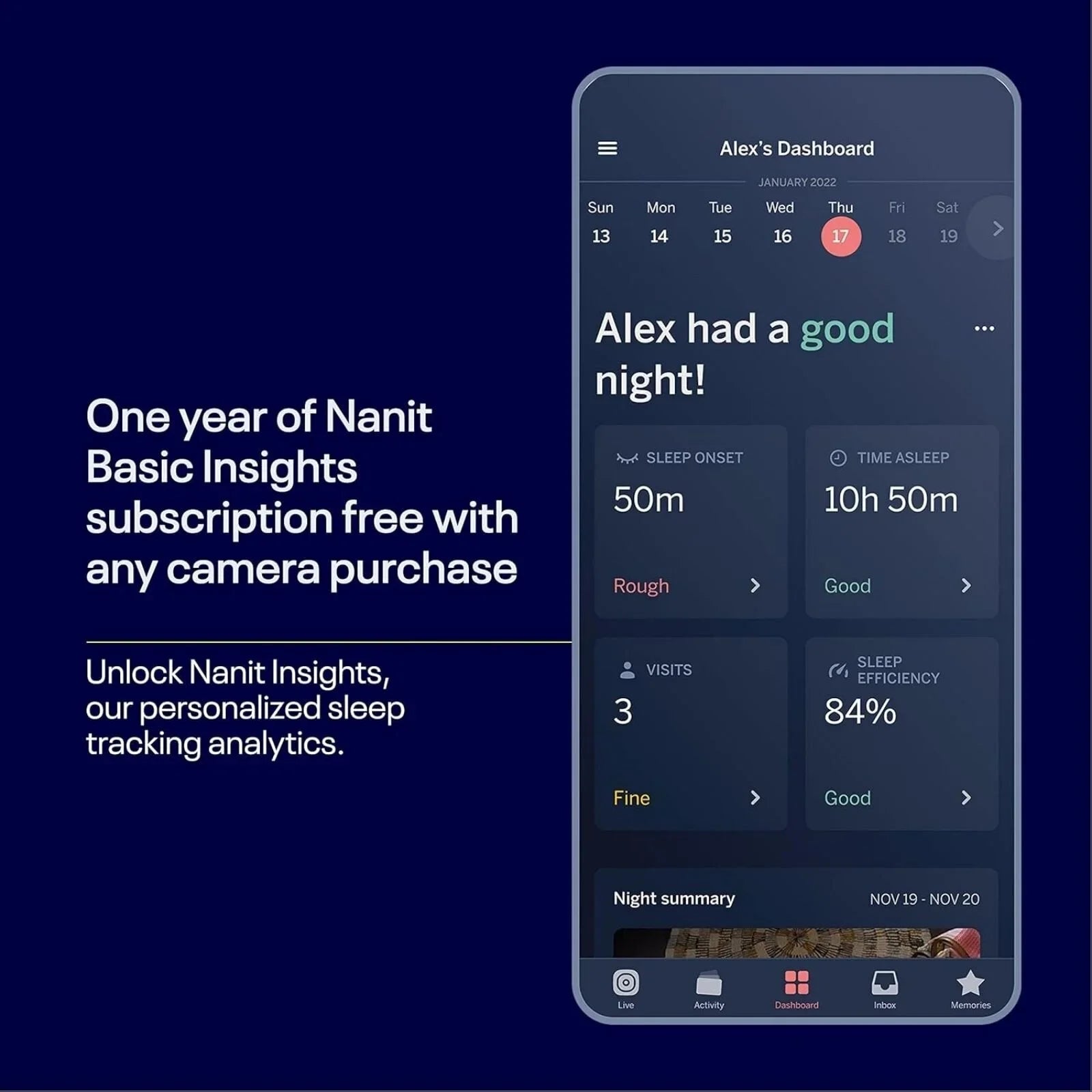 • Nanit Insights provides detailed sleep history, video recordings, and developmental tracking.