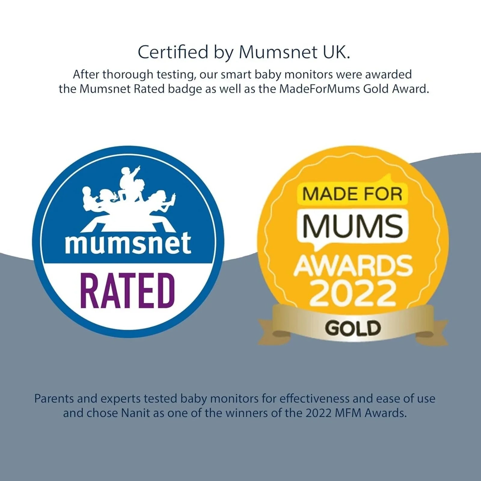 The Nanit Pro Baby Monitor & Wall Mount is a smart baby monitor designed not only to watch your baby but also to help improve their sleep quality. Its 1080p HD camera provides a crystal-clear bird’s-eye view of your little one, day and night, while the sensor-free breathing monitoring technology ensures safe and accurate tracking. With personalised sleep analysis and expert guidance, it helps enhance your baby’s sleep routine. Two-way audio, sound and motion detection keep you connected at all times, and temperature and humidity monitoring ensure a comfortable environment. The Split Screen feature allows you to view two cameras simultaneously, while the wall mount with secure cable management offers a sleek and safe setup. The perfect combination of peace of mind and restful nights for parents.