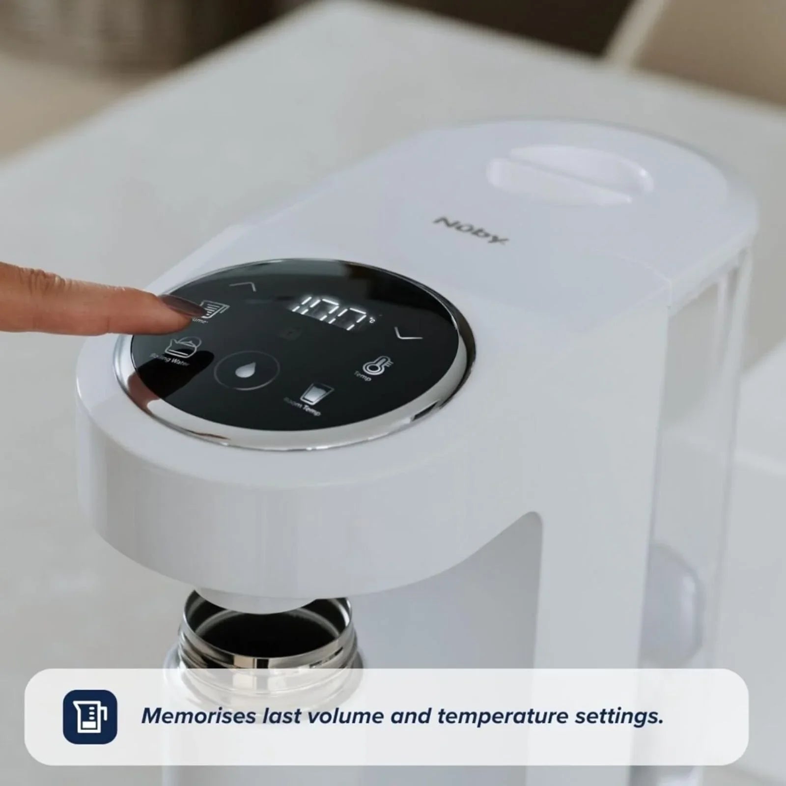 The Nuby RapidHot will be your go-to helper to speed up and simplify your baby's feeding routine! This smart device delivers instant boiling water, saving you time while preparing formula safely following NHS guidelines. Its filtration system removes unwanted impurities from the water. It also remembers your last used feed size for added convenience. With its quiet operation, you can easily prepare night feeds without disturbing anyone.