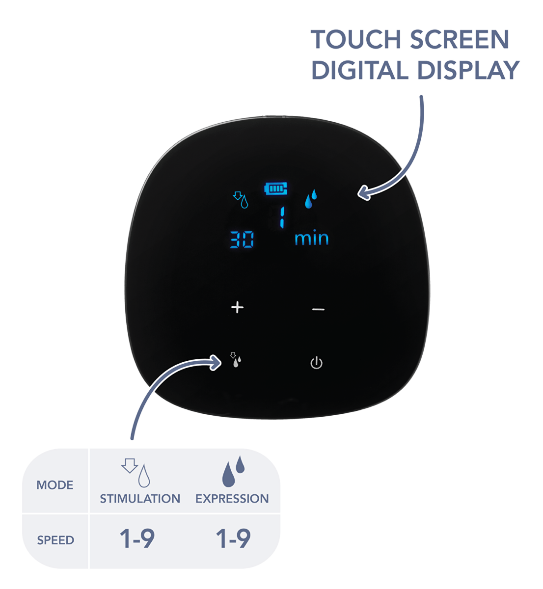 - Digital touch-screen display panel perfect for night time expressing, monitoring expression time & adjusting levels
