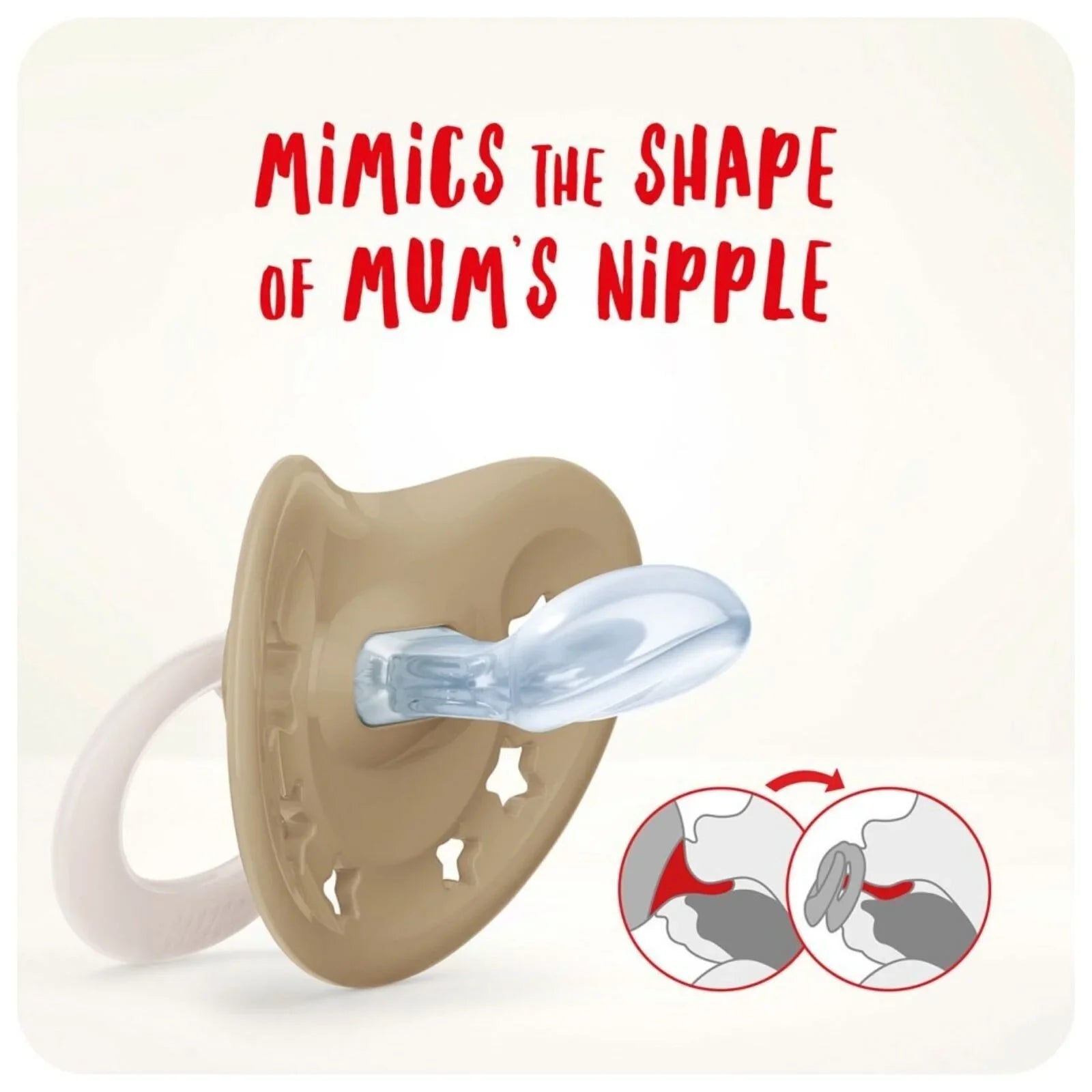 NUK Signature Soothers are just as good a choice today as they have ever been Natural and shaped to suit the jaw, with modern colours and motifs, the NUK Signature has been comforting children for generations.