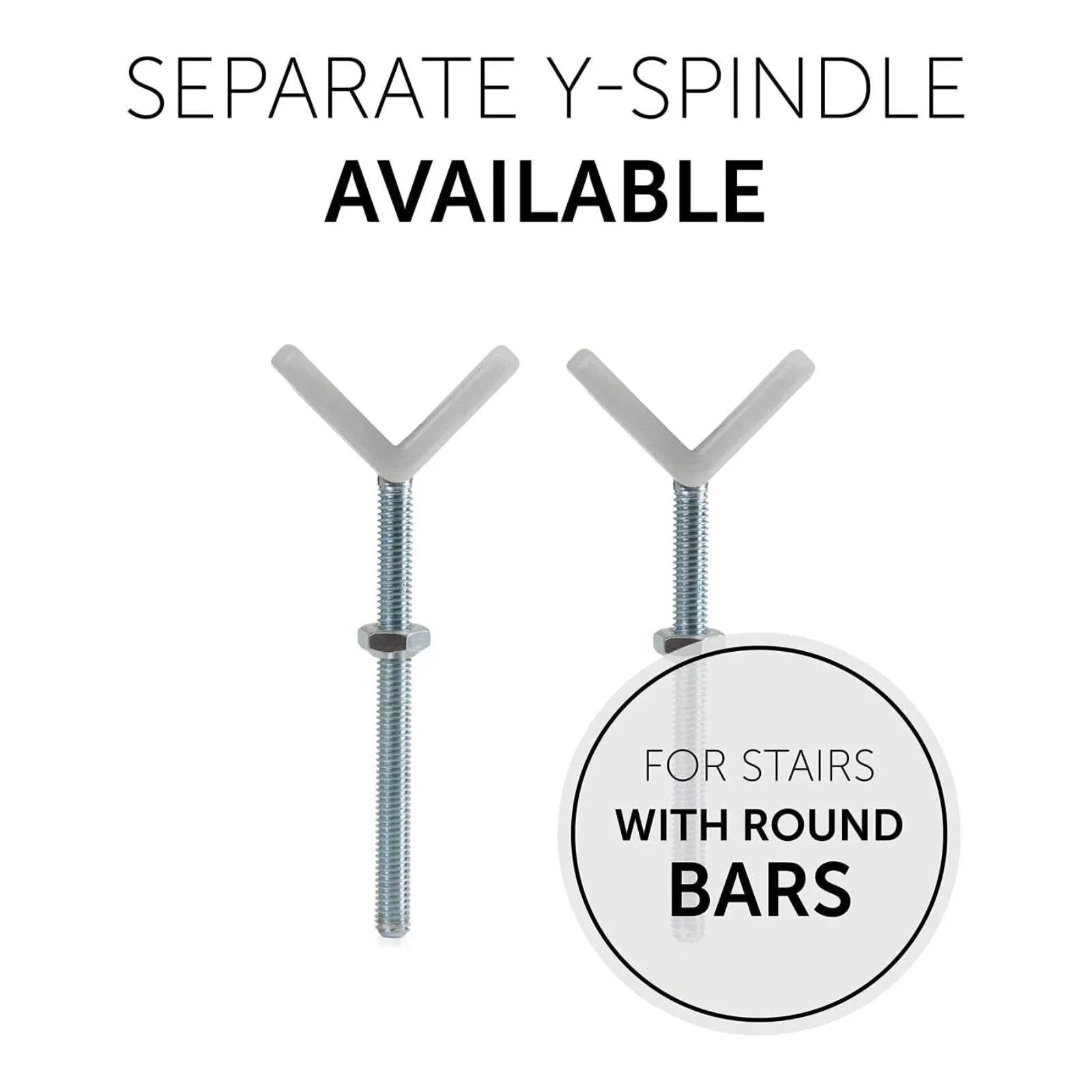 Functionality: The safety gate is clamped between the door frame or stairs with four adjusting screws and the included accessories, so no drill holes are created. The child safety gate can be extended with two extensions (one per side) of 9 cm or 21 cm and combined with the Y-spindle for stair railings with round spars. The initially crooked side panel is straightened by tightening the adjusting screws, ensuring a secure hold and parallel fixation.