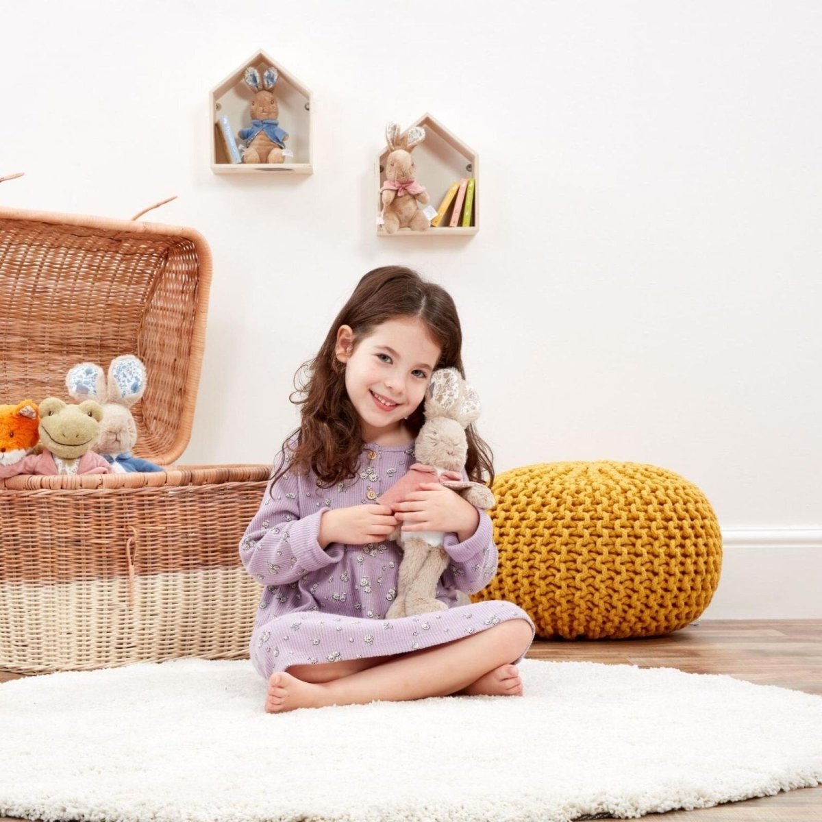 Cuddle time or playtime, Flopsy Bunny just loves them both! This exquisite super soft and cuddly Signature Flopsy Bunny Rabbit Soft Toy, from Rainbow Designs, makes a truly special companion to enjoy playtime adventures with as well as a cuddly best friend when it comes to snuggling up at bedtime! This adorable Flopsy Bunny soft toy, in her beautiful pink cape, is produced from the finest fabrics and finished with all the beautiful trimmings and details you would expect in this very special gift, with bespoke labels and finished with a special Beatrix Potter pattern. Flopsy's bean filled tummy makes her extra cuddly and his long limbs make her easy for little ones to hold onto, and take along on fun-packed adventures! Beatrix Potter's Flopsy Bunny is one of the most traditional and much-loved children's characters, and this super cuddly toy is perfect way of sharing happy memories and traditional values from your own childhood, and providing a life-long cuddly friend for little one.