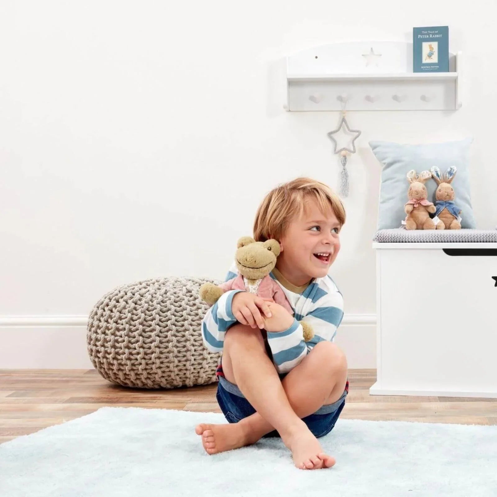 The adventurous but slightly accident-prone Jeremy Fisher is all dressed up for dinner with his friends but this smartly dressed character is actually super soft and absolutely loves a big squeezy cuddle! This Jeremy Fisher Soft Toy, from Rainbow Designs' Peter Rabbit Signature Collection, makes a fun and extra special companion to enjoy playtime adventures with as well as a cuddly friend when it comes to snuggling up at bedtime! The colourful Jeremy Fisher frog soft toy, in his stylish velveteen tail coat and bespoke patterned waistcoat, is produced from the finest, high quality fabrics and finished with all the beautiful trimmings and details you would expect in this exquisite gift. Jeremy Fisher may be smartly dressed but his bean-filled tummy makes him as soft and cuddly as he looks, and his extra long limbs make it easier for little hands to hold onto and take on mischievous and fun-filled adventures! The Tale of Jeremy Fisher is one of the much- loved children's stories by Beatrix Potter of an adventurous frog, on his lily pad boat, who sets of to catch dinner for his friends, but decides he doesn't like fishing after nearly being eaten by a trout! This super cuddly frog toy makes the perfect keepsake gift for any young fan of the Beatrix Potter tales, creating a life-long cuddly friend for little one, as well as sharing happy memories and traditional values from your own childhood. As part of the Rainbow Designs' Signature Collection little ones can also collect Peter Rabbit, Flopsy Bunny and Mr Tod soft toys and have plenty of animal-filled adventures of their own, just like Beatrix Potter did!