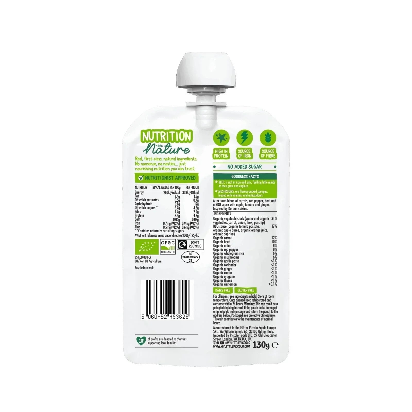 Piccolo Organic Korean BBQ Beef is made with organic grass-fed beef, carrots, red pepper, and a light BBQ sauce with apple, tomato, and ginger. Packed with protein and fibre, it supports your baby’s healthy growth and development. With its dairy-free and gluten-free recipe, it’s a safe option for sensitive tummies. The 130g convenient pouch makes it easy to serve at home or on the go. A perfect way to introduce your little one to exciting new tastes and flavours from around the world!