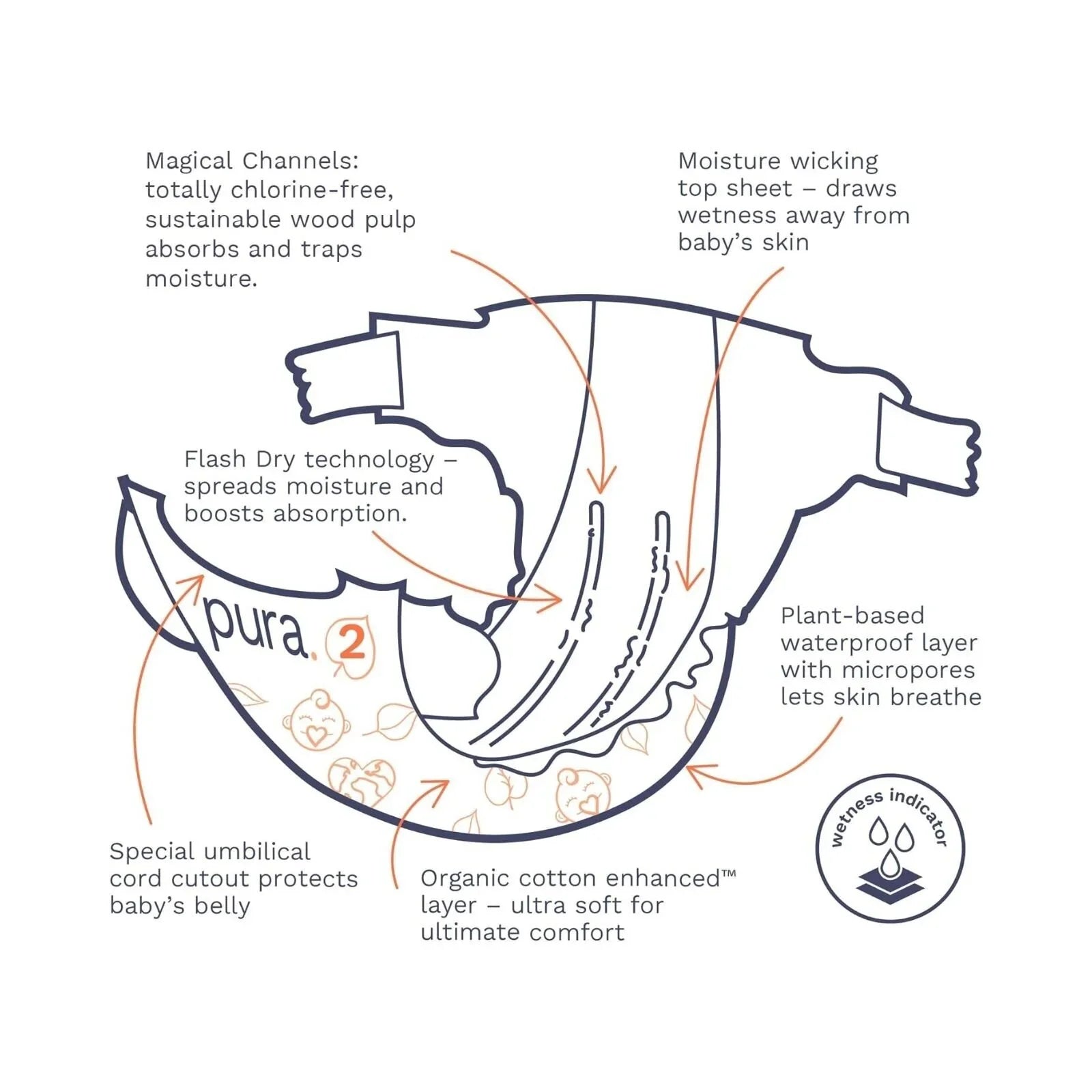 My Pura Eco Nappy Size 2 is a super-softnappy that adapts to your baby’s delicate skin. Certified by Allergy UK andtotally chlorine-free (TCF), it is free from allergens, parabens, latex,fragrance, and lotion. Offering up to 12 hours of leak protection, it featuresa wetness indicator and an umbilical cut-out for added comfort. Enriched withorganic cotton, it also has FlashDry technology to reduce the risk of nappyrash and irritation. Your baby will feel more comfortable than ever!