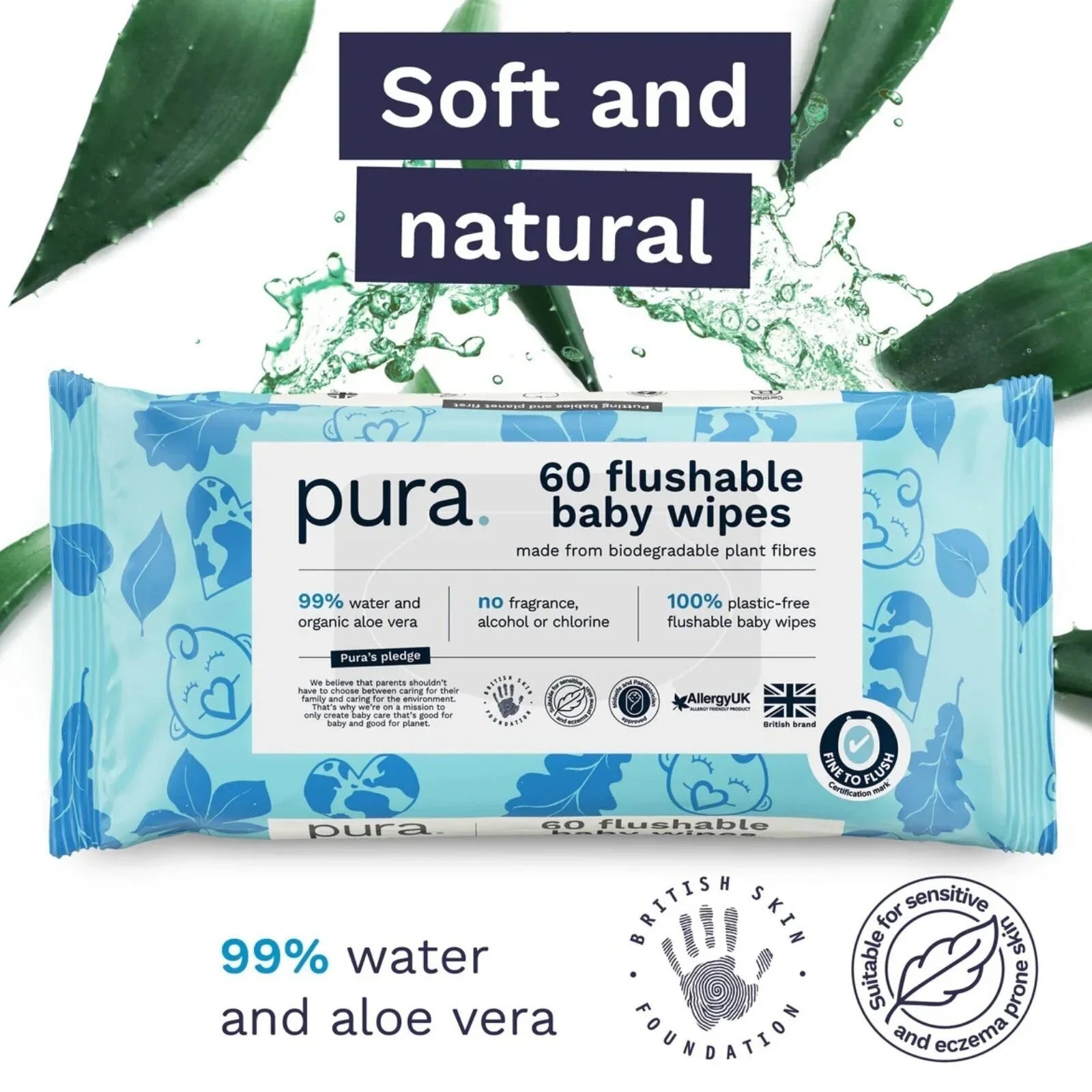Pura Flushable Wipes offer gentle cleansing for sensitive skin, made with 99% water and organic aloe vera. Their 100% plastic-free, biodegradable material makes them kind to the planet. Officially certified “Fine to Flush” by Water UK, they are genuinely safe to flush. Approved by Allergy UK and the British Skin Foundation, they’re an ideal aid during potty training.