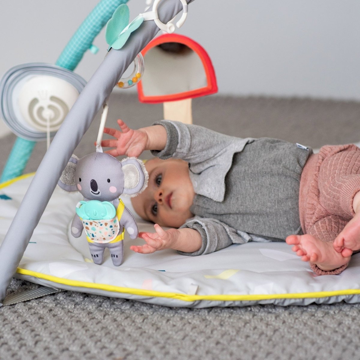 - Includes five additional playful, multi sensory hanging toys : double sided crinkling "Sensi-center", rattling Kimmy Koala with baby teether, Scotty the snail toy with an additional teether, double sided mushroom with baby safe mirror, butterfly ring rattle and a musical toy with colorful lights.