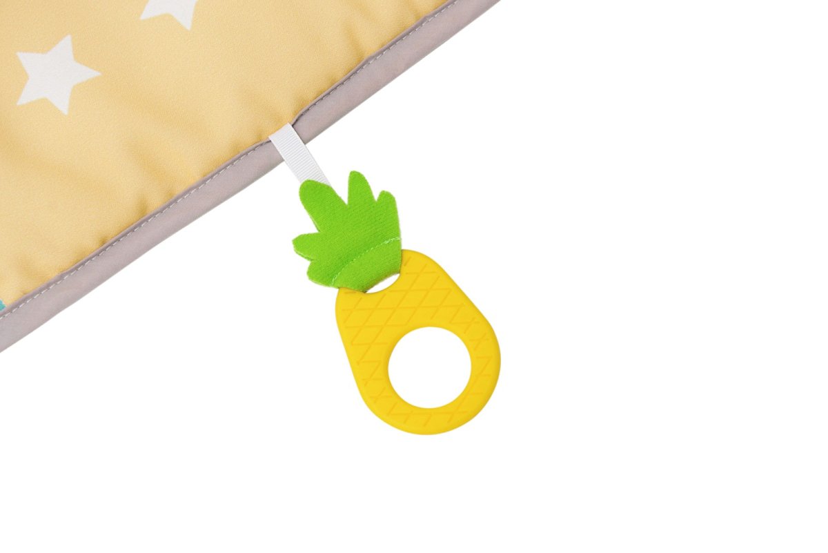 But the fun doesn't stop there. The I Love Big Mat also includes a range of interactive activities that will help your baby develop their fine and gross motor skills. A baby-safe mirror is perfect for self-discovery, while plastic rings and a pineapple teether provide tactile stimulation. The textured fabrics with crinkling parts add another layer of sensory exploration that babies adore.