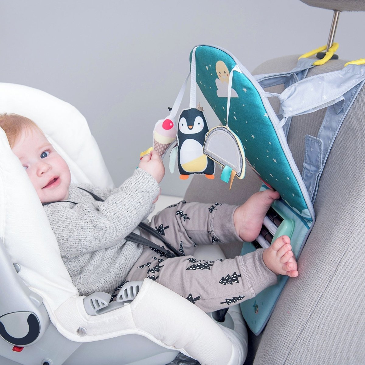 - Includes three loveable hanging toys - a rattling penguin, rainbow baby-safe mirror and a crinkling ice-cream cone.
