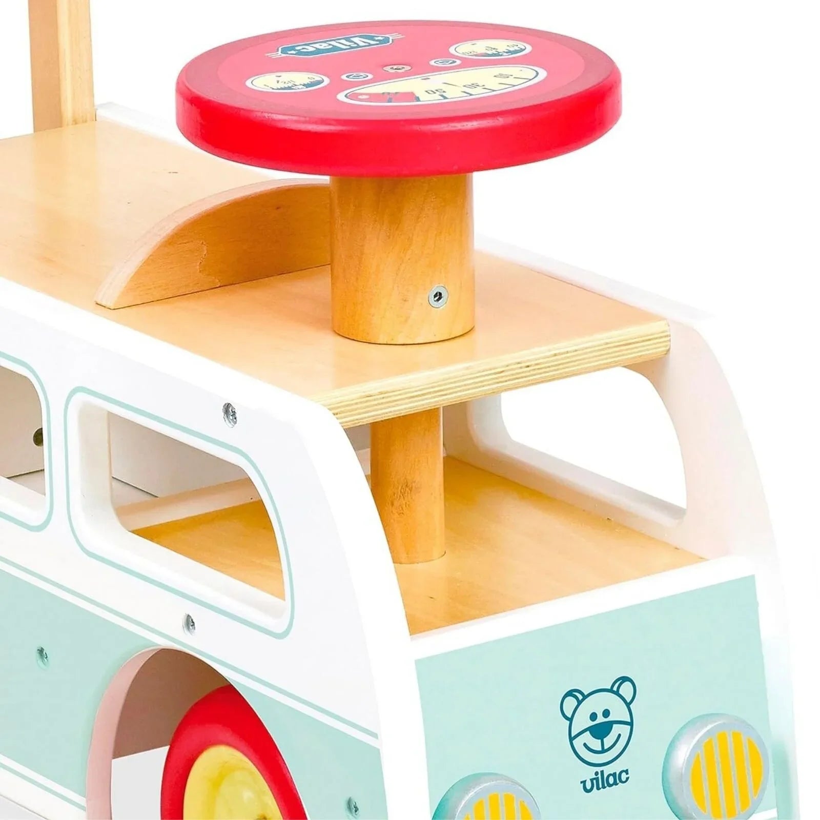 The Vilac 2-in-1 Retro Wooden Camper Van is the perfect starter toy for children! This retro-style wooden toy, designed for both walking and riding, helps develop your baby's motor skills while providing hours of fun. Its unique rear compartment prevents tipping for added safety. The toy also features a hidden compartment, perfect for storing small toys or comfort items.